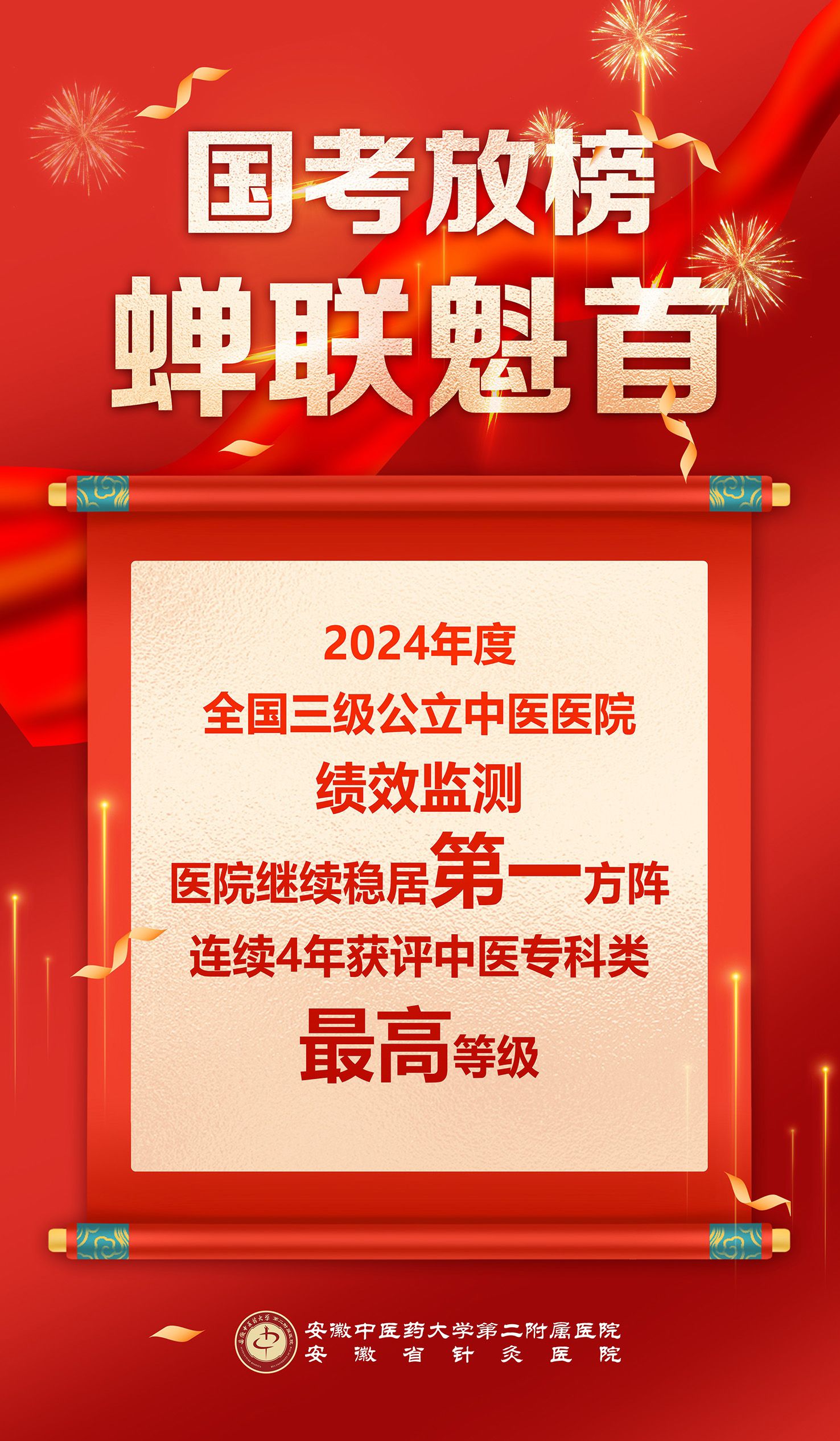 近日,2024 年度全国三级公立中医医院绩效监测(“国考”)结果正式发布,我校第二附属医院再度获评中医专科类别最高评级,连续四年稳居全国第一方阵,以持续稳健的综合实力,彰显医院高质量发展的坚实底色。“国...