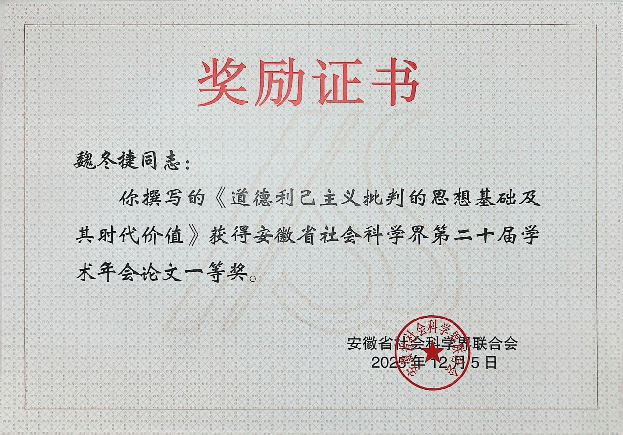 近日,从安徽省社会科学界联合会传来喜讯,马克思主义学院科研工作斩获多项荣誉,再添丰硕成果。魏冬捷在安徽省社会科学界第二十届学术年会上荣获“一等奖”;李虹曼、邓明峰、郭跃在2025年度“三项课题”研究活...