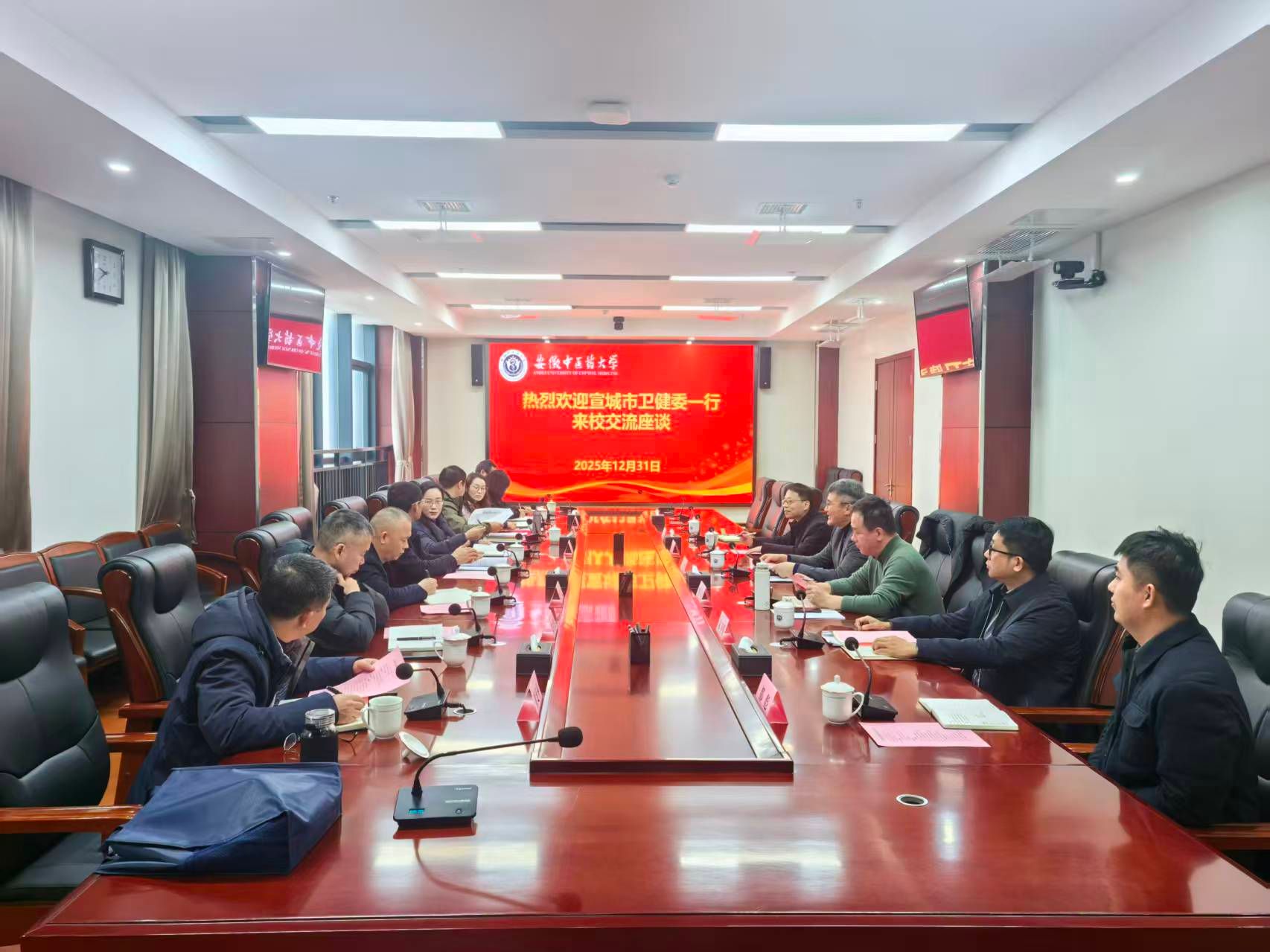 2025年12月31日上午,宣城市卫健委钟良胜调研员率广德市、泾县等相关单位到访我校,围绕校地中医药领域合作事宜开展交流座谈。学校教务处、社会合作处、校健康产业公司相关负责同志参会,会议由社会合作处方晓处...
