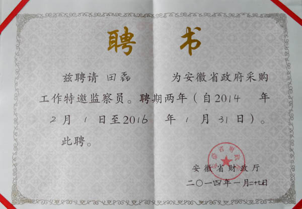 日前,安徽省财政厅颁发聘书,授聘学校纪委办公室主任、监察处副处长田磊为安徽省政府采购工作特邀监察员。 聘任省级政府采购特邀监察员是省财政厅规范政府采购行为,加强社会监督,促进廉政建设的重要举措。...