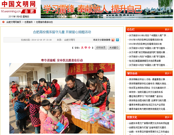温暖进社区,志愿者齐行动。为了在寒冷的冬季给社区居民们送去温暖与关爱,普及中医药学常识,2014年12月27日,药学院学生会携手华佗爱心社、大学生推拿学社在合肥市皖江小区开展了“创建全国文明城市 志愿者在行...
