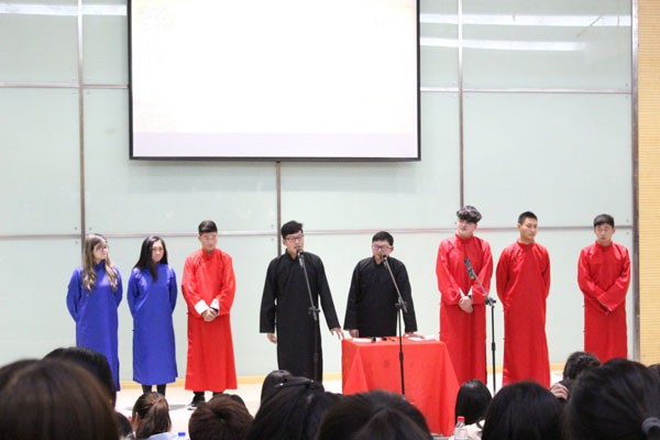 3月30日晚,医药经济管理学院在教学楼B301举办以“以传统之相,道文化之声”为主题的相声大会。经管学院党总支书记吴成海、辅导员方悦、孙孝涧观看了晚会。 来自经管学院相声社的9名成员与一把折...