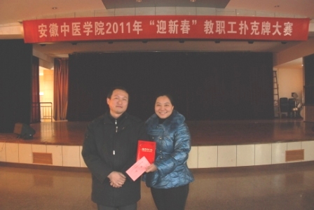 1月7日-8日举行了安徽中医学院2011年“迎新春”教职工扑克牌大赛,国际教育交流学院共选派了两队选手参加,分别是张宽新、程玲老师及夏晓红、苏昕老师。 最终张宽新和程玲老师在高手如云的比赛中,一路过关斩...