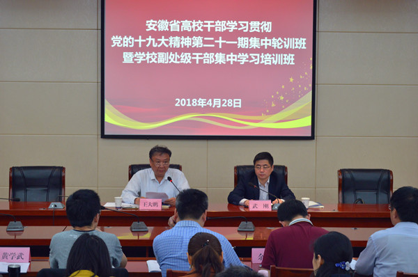 4月28日上午,学校举行副处级干部集中学习贯彻党的十九大精神培训班暨安徽省高校干部学习贯彻党的十九大精神第二十一期集中轮训班开班式。校党委书记王大鹏出席开班仪式并做动员讲话。校党委组织部部长武刚主持开...