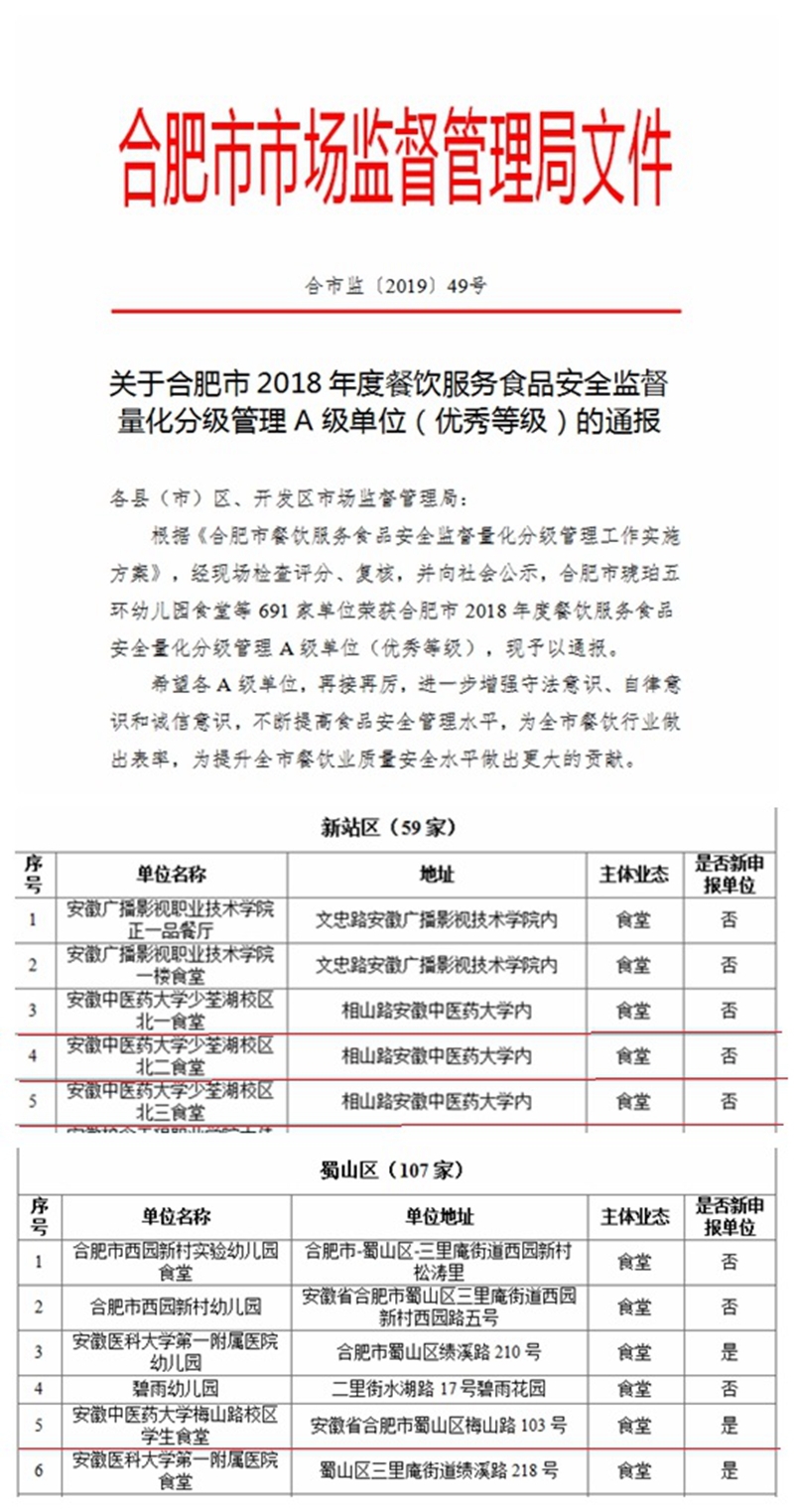 近日,合肥市市场监督管理局下发文件,通报合肥市2018年度餐饮服务食品安全监督量化分级管理A级单位(优秀等级)名单,我校少荃湖校区北一食堂、北二食堂、北三食堂、梅山路校区学生食堂获得“A级单位”称号。餐...