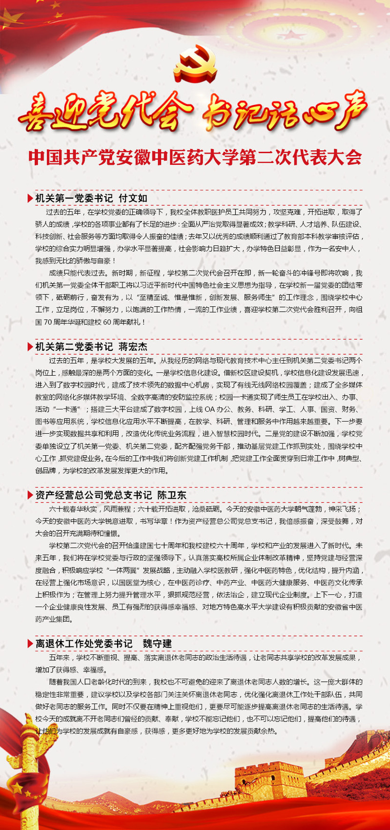 编者按:全校师生医护员工热切期盼的中国共产党安徽中医药大学第二次代表大会即将召开,大会将汇聚全校师生智慧和力量,规划学校未来五年的发展蓝图,齐心协力、改革创新,共谋学校新发展。学校党委宣传部特别策...