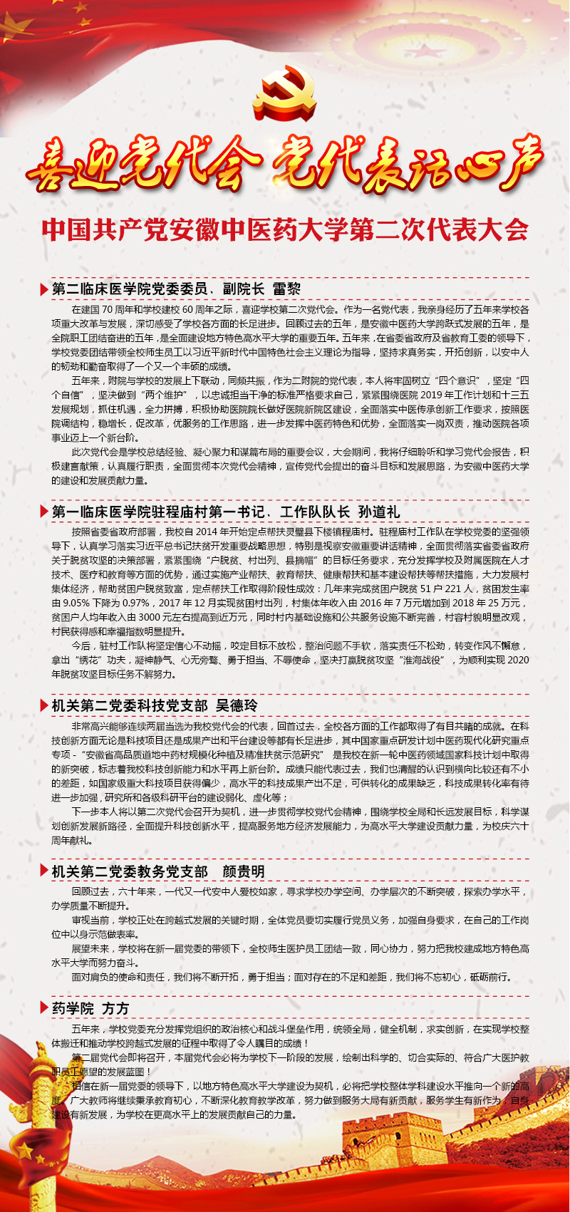 编者按:全校师生医护员工热切期盼的中国共产党安徽中医药大学第二次代表大会即将召开,大会将汇聚全校师生智慧和力量,规划学校未来五年的发展蓝图,齐心协力、改革创新,共谋学校新发展。学校党委宣传部特别策...