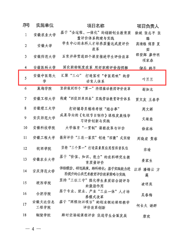 近日,安徽省教育厅公布了2022年度教育评价改革优秀案例,我校团委书记、劳动教育教研室主任叶兰兰负责的《汇聚“三心”打造富有“中医药味”劳动育人体系》榜上有名。为深入贯彻落实中央和我省关于深化新时代教...
