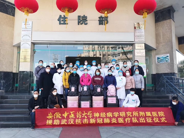 2月20日,安徽中医药大学第三批支援湖北医疗队16名队员集结完毕,出征湖北,奔赴新冠肺炎防疫一线。自安徽省卫生健康委下发组派医疗队支援湖北的通知以来,学校附属医院相关科室医护人员纷纷请战,要求到疫情防控一线去。最终遴选出学校第一附属医院呼吸内科副主任医师童佳兵,重症医学科副主任医师聂卫群,老年病呼吸内科副主任朱春冬,内科护士柏玲、翁菲菲,重症护士许刚、方广东7人;第三附属医院呼吸内科医生孔令洋、王六喜,重症医学科医生韦彪,重症医学科护士代冰雪,脑病二科护士许孝姗5人;神经病学研究所附属医院护士陈萍萍、陈元元、卞蓓蓓、李婷婷4人组成的医疗队驰援湖北。“抗击疫情,全力以赴!使命必达!”整装待发的医疗队队员士气昂扬、精神饱满,充满必胜决心。