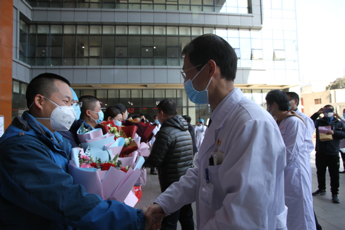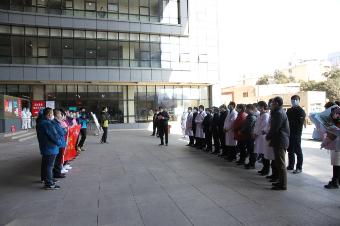 医院职工代表向支援湖北的全体医疗队员送上鲜花和祝福,以热烈的掌声向出征队员的家人致敬、致谢。