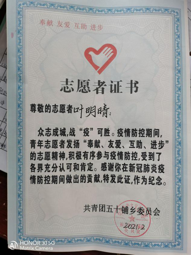 “志愿者既是奉献者,也是受益者”,2020级中西医临床医学(1)班范孝莉以前并不太懂得这句话的意思,可在寒假参加了村庄防疫志愿服务工作后,她真正理解了这句话的深刻含义。虽然每天重复一样的工作,给村庄里的人讲解防疫知识、防疫规则,认真仔细地登记返乡务工人员的工作和住址,她却从未觉得枯燥。她说:“有多少事情是我们之前没有做过的,有多少事情是在考验我们的责任心和纪律性的,这里的每一个人,每一分钟,都在成长。这样一段志愿服务经历将是我一生中最难忘的回忆。以后,我会继续参加志愿活动,努力提升自己,为社会尽自己的一份绵薄之力。”
