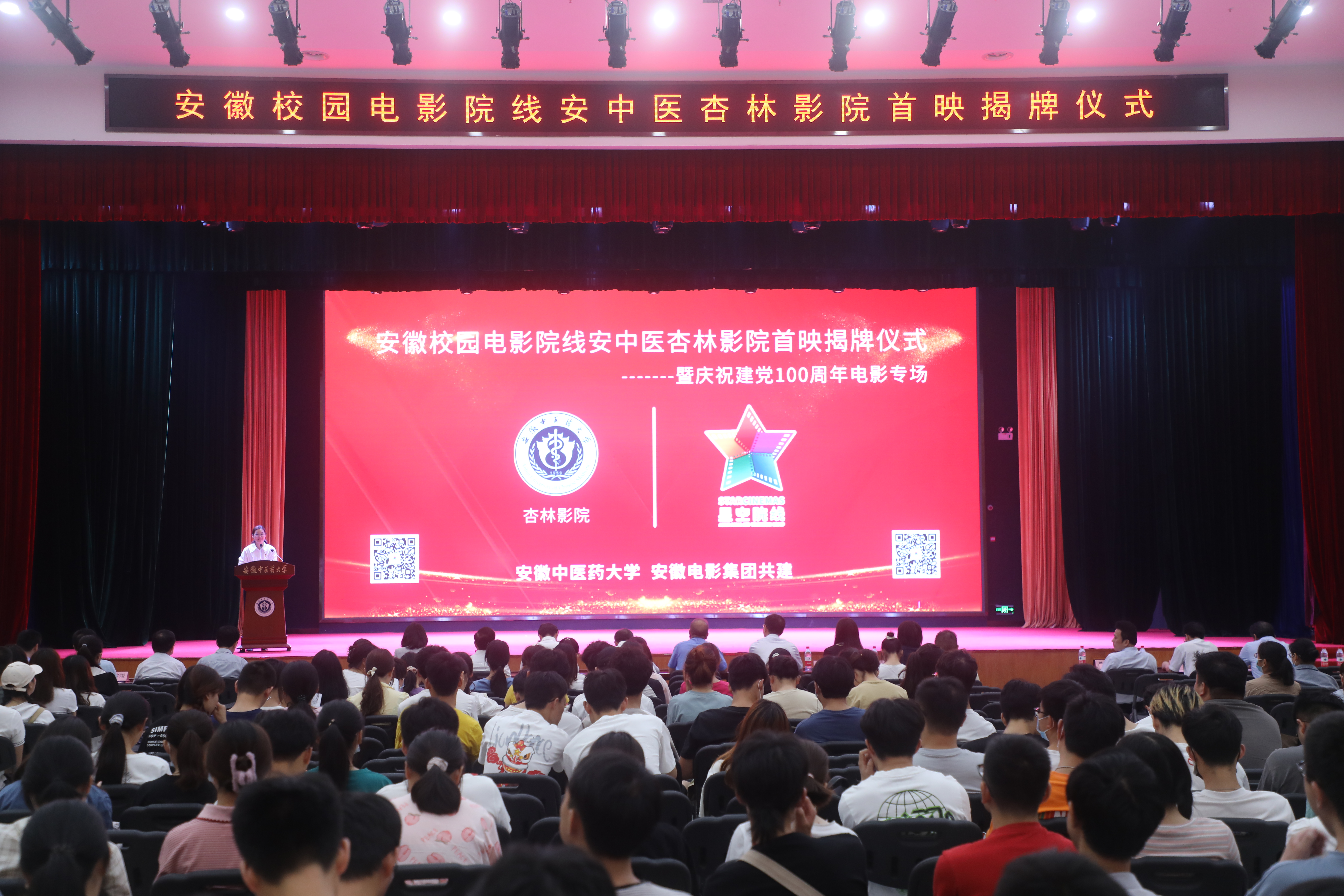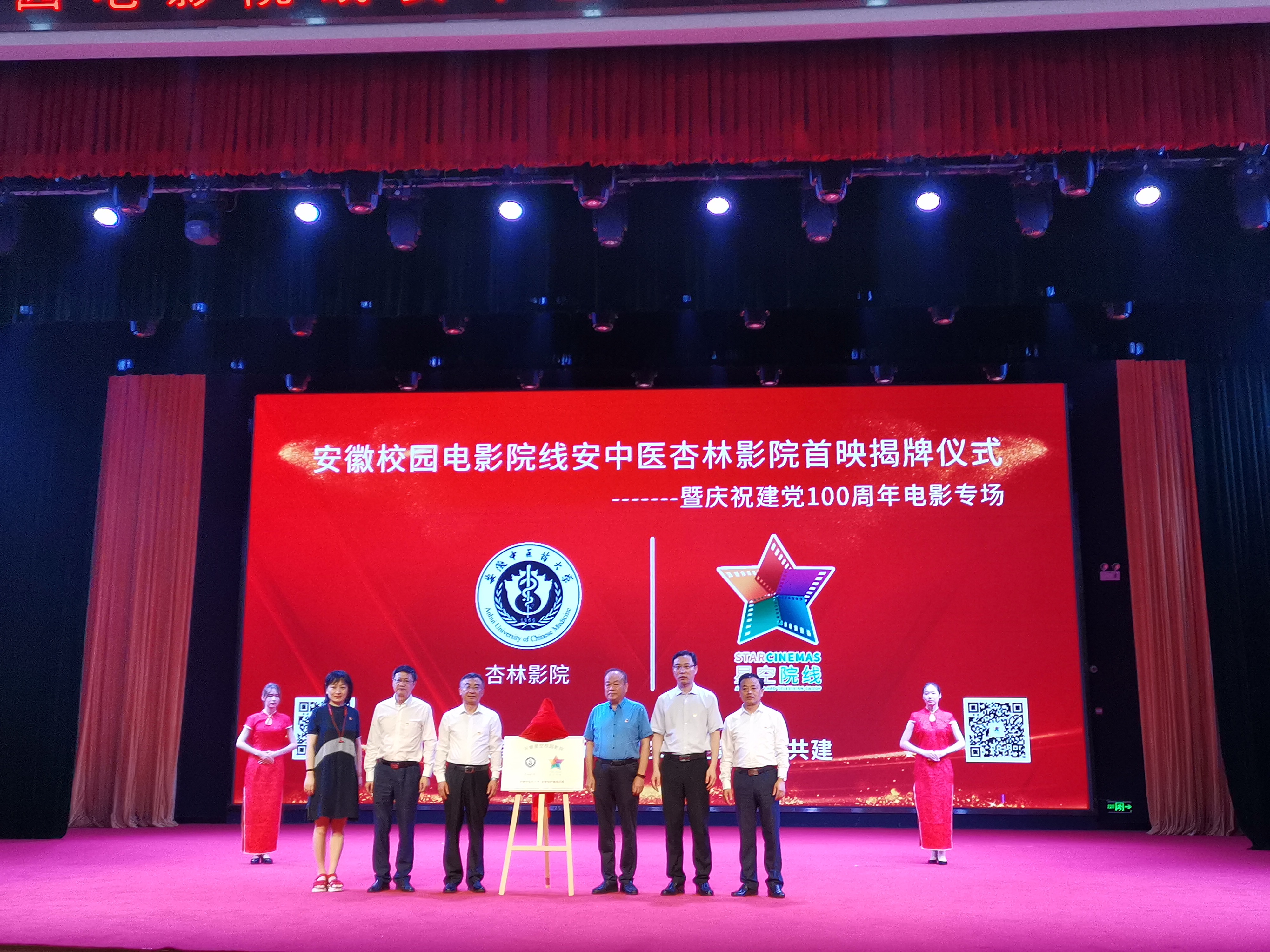 6月29日上午,安徽校园电影院线、安徽中医药大学杏林影院举行首映揭牌仪式。学校党委书记王先俊、党委副书记张永群,安徽广电集团党委书记、董事长李树,党委委员、工会主席胡滨,办公室主任黄晓丹,安徽电影集团党总支书记、董事长虞咏,学校党委常委、宣传统战部部长吴达武,教务处、学生处、总务处、工会、等部门及二级学院负责人出席了会议。