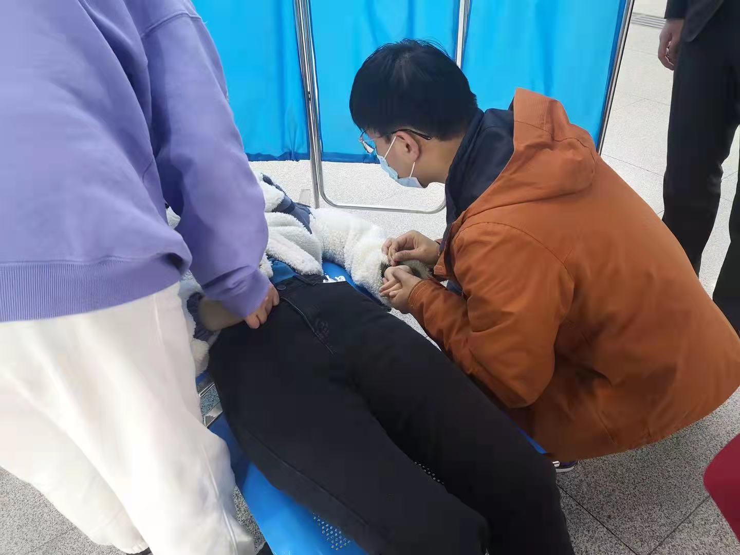 11月29日,在合肥市西七里塘地铁换乘站,晚高峰下班的人群熙熙攘攘,突然一名女乘客昏倒在地,地铁站乘务人员围起屏风进行紧急施救治疗,正在下班途中的我校针灸推拿学院青年教师齐亚军和同事项水英看到人群围在一起,出于医生直觉来到昏倒的女乘客身边,齐亚军亮明了自己主治医师身份,并拿出随身携带的针灸包,进行针刺治疗,女乘客的情况很快有所好转,并被送往附近医院进行进一步治疗。