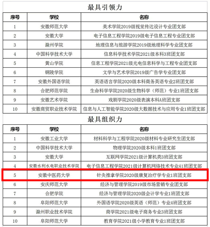 为深入学习宣传贯彻党的二十大精神,特别是习近平总书记关于青年工作的重要思想,经过为期4个月的校级展示、省级展示环节,结合展示平台的点赞以及线上答辩评审情况,2022年安徽省高校联通杯“活力团支部”最具引领力TOP10榜(共60个团支部)、“活力社团”TOP5榜(共35个社团)名单公布。