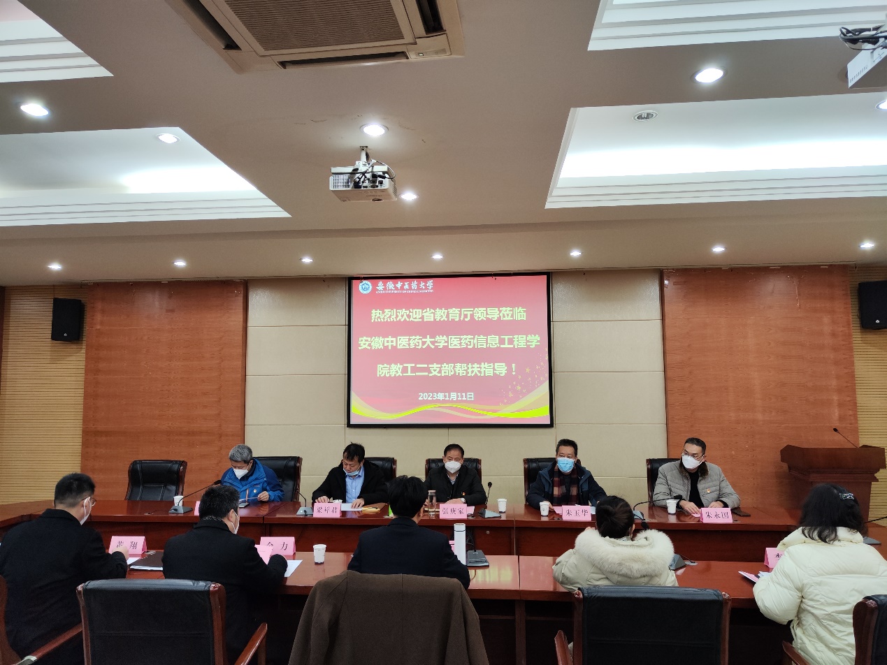 1月11日,省委教育工委委员、省教育厅副厅长张庚家,率省教育工委组干处处长朱玉华,省教育厅科研处处长梁祥君、高教处副处长朱永国、学生处副处长查晓陆等莅临我校,参加结对帮扶党支部——医药信息工程学院第二教工党支部支委活动,对党建及发展工作进行帮扶指导。