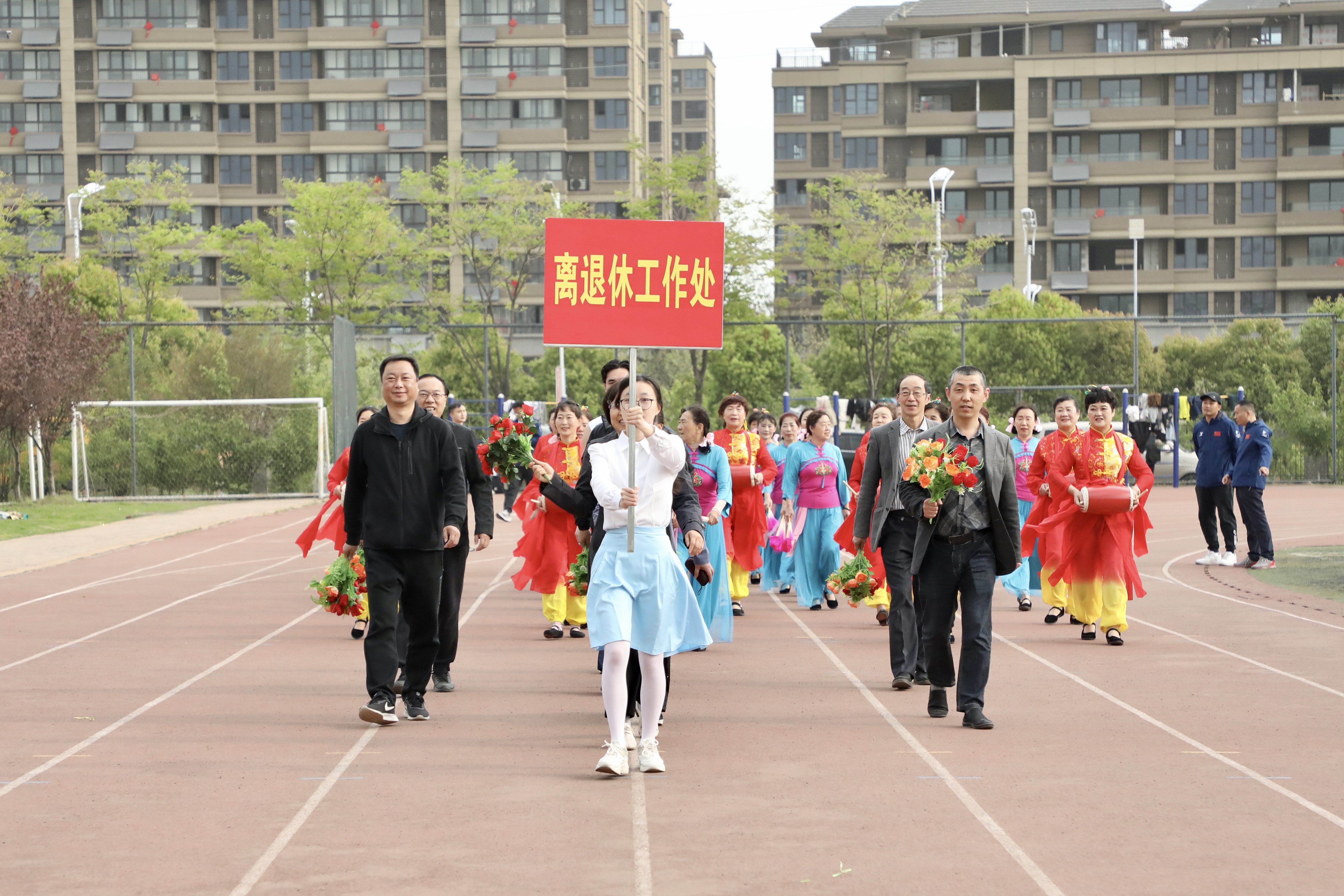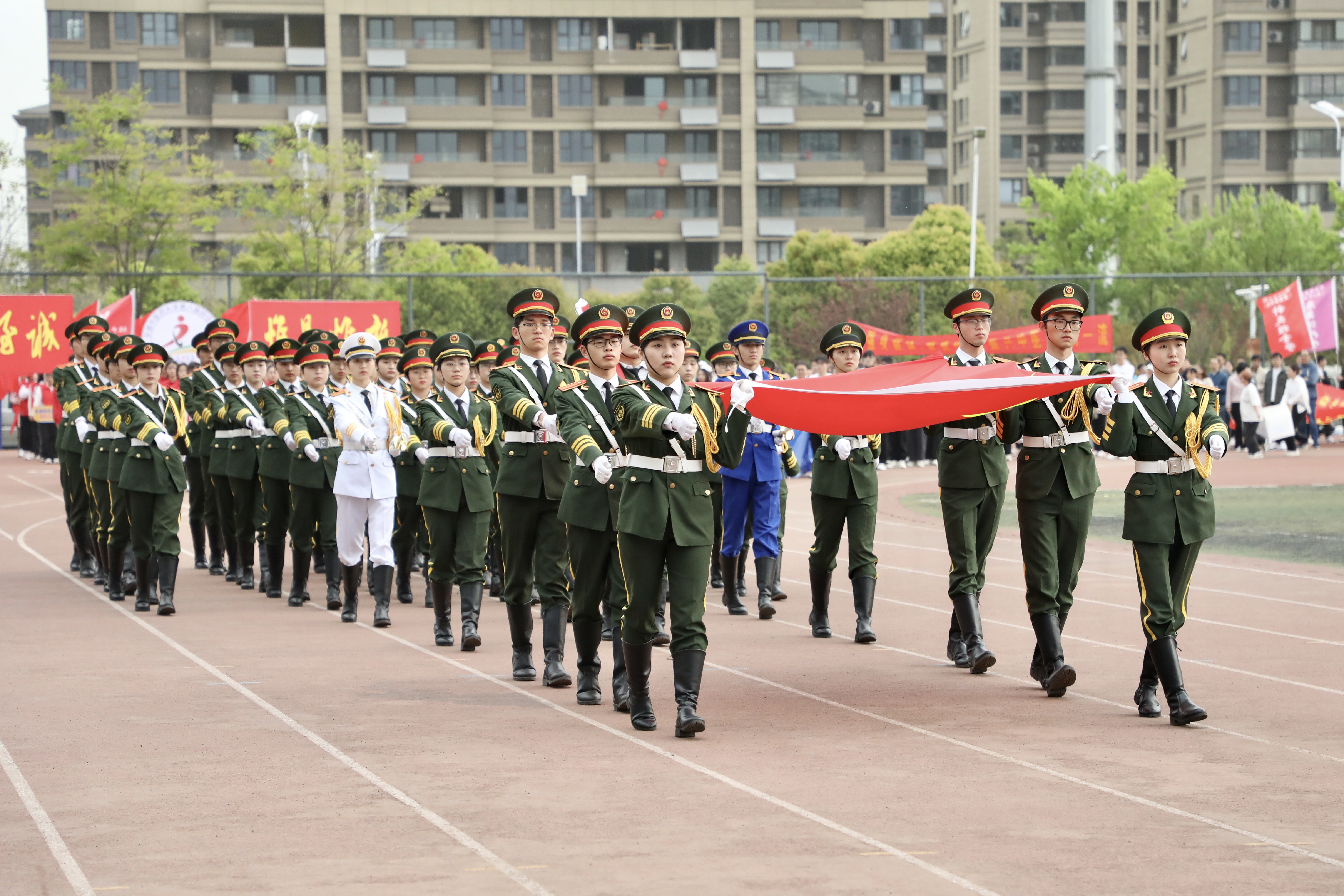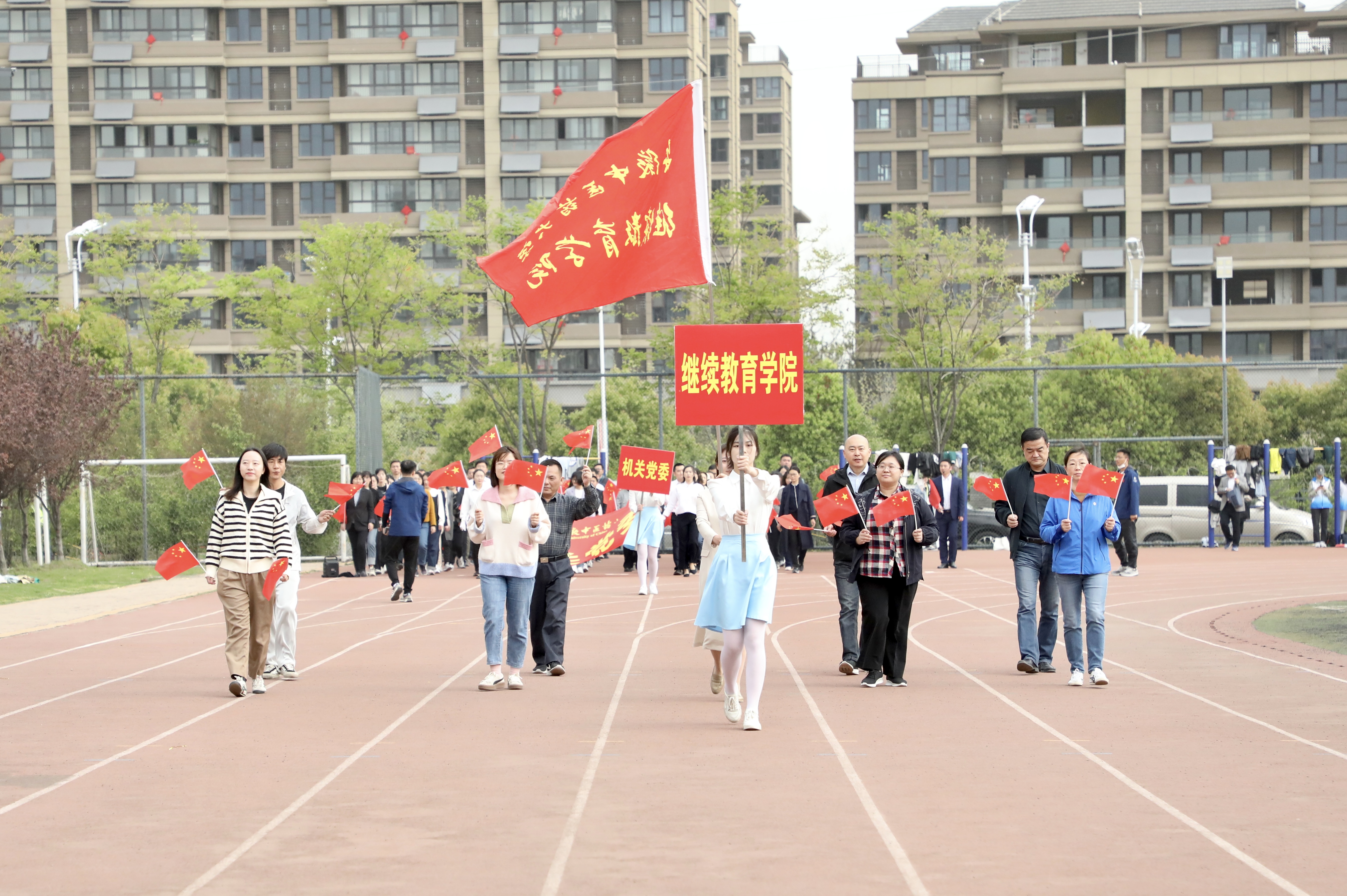 国旗护卫队迈着铿锵有力的步伐,护送五星红旗至运动场升旗区,随着主持人“升国旗,奏国歌”一声令下,全场齐声高唱《义勇军进行曲》,鲜艳的五星红旗冉冉升起。各单位方阵依次通过主席台接受检阅,他们精神抖擞、口号响亮、意气风发,主席台和观众席向各方阵精彩的展示报以热烈掌声。