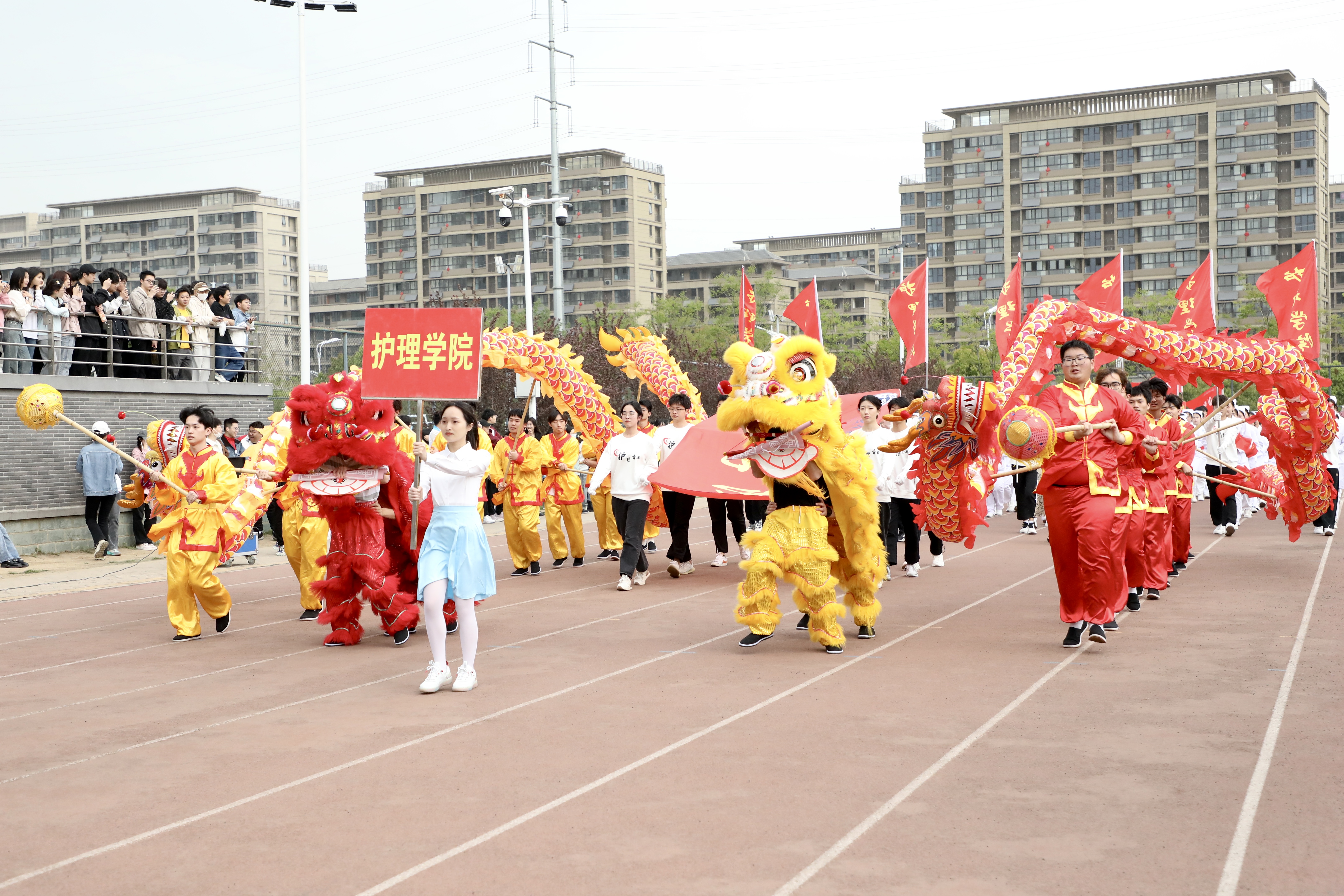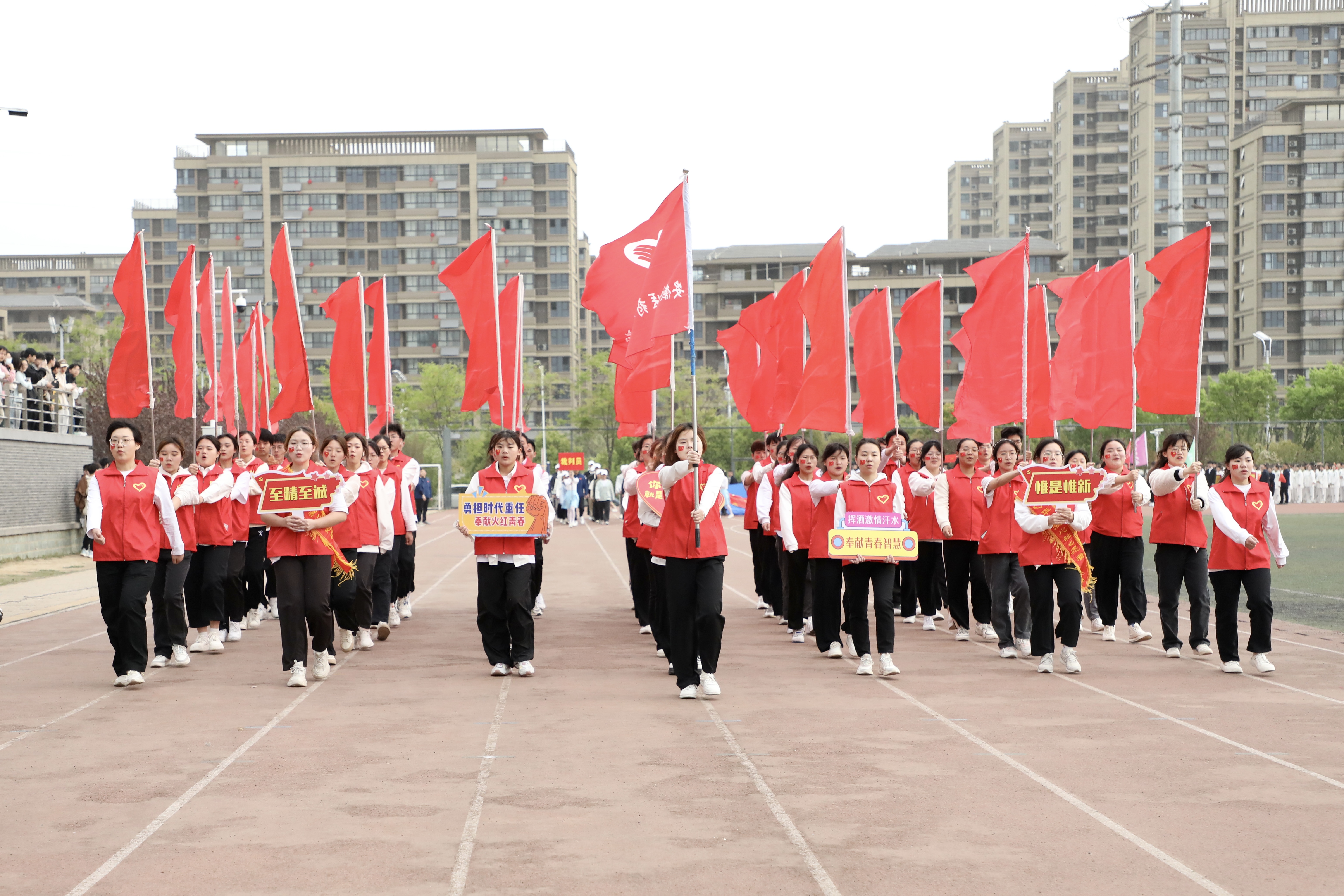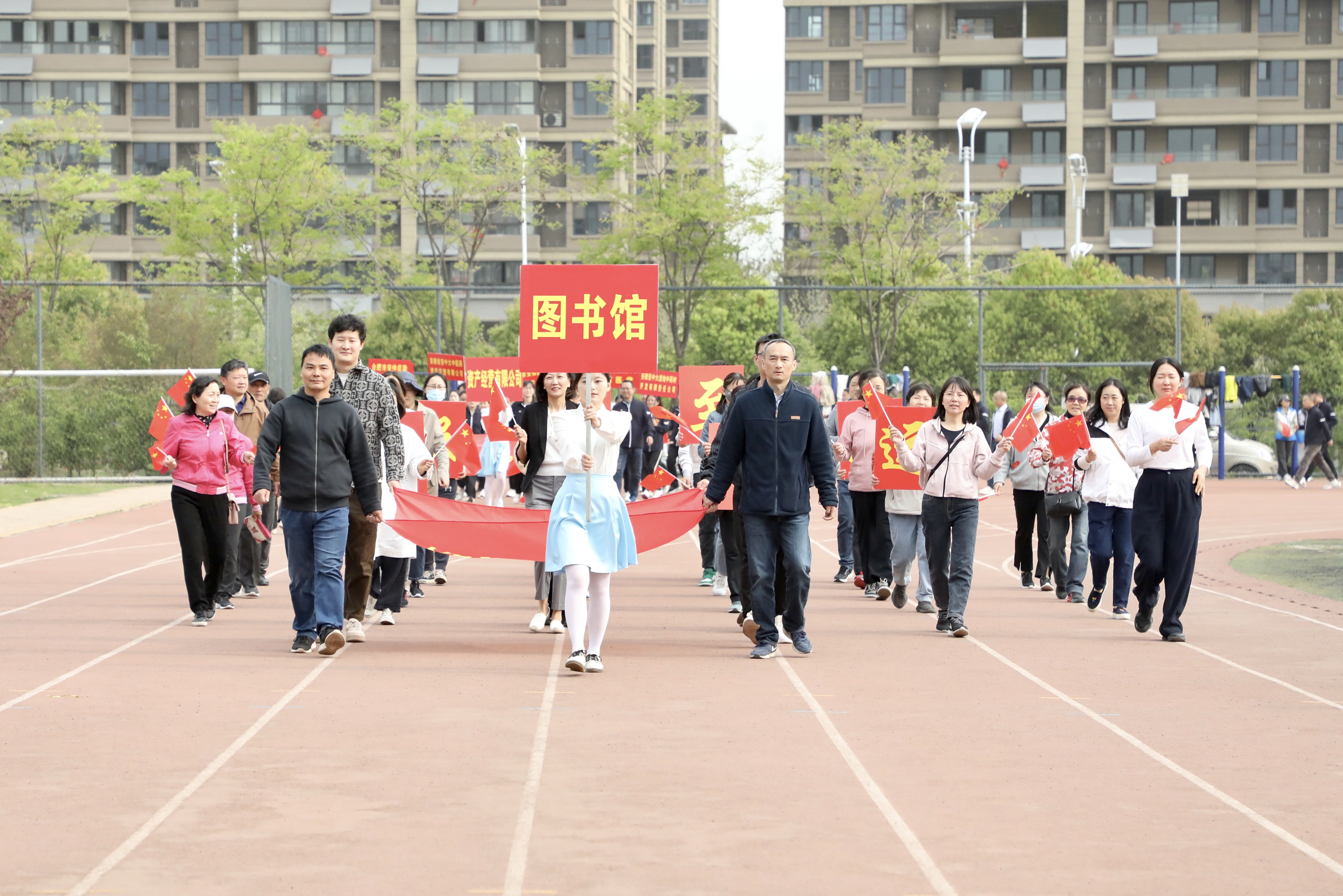 国旗护卫队迈着铿锵有力的步伐,护送五星红旗至运动场升旗区,随着主持人“升国旗,奏国歌”一声令下,全场齐声高唱《义勇军进行曲》,鲜艳的五星红旗冉冉升起。各单位方阵依次通过主席台接受检阅,他们精神抖擞、口号响亮、意气风发,主席台和观众席向各方阵精彩的展示报以热烈掌声。