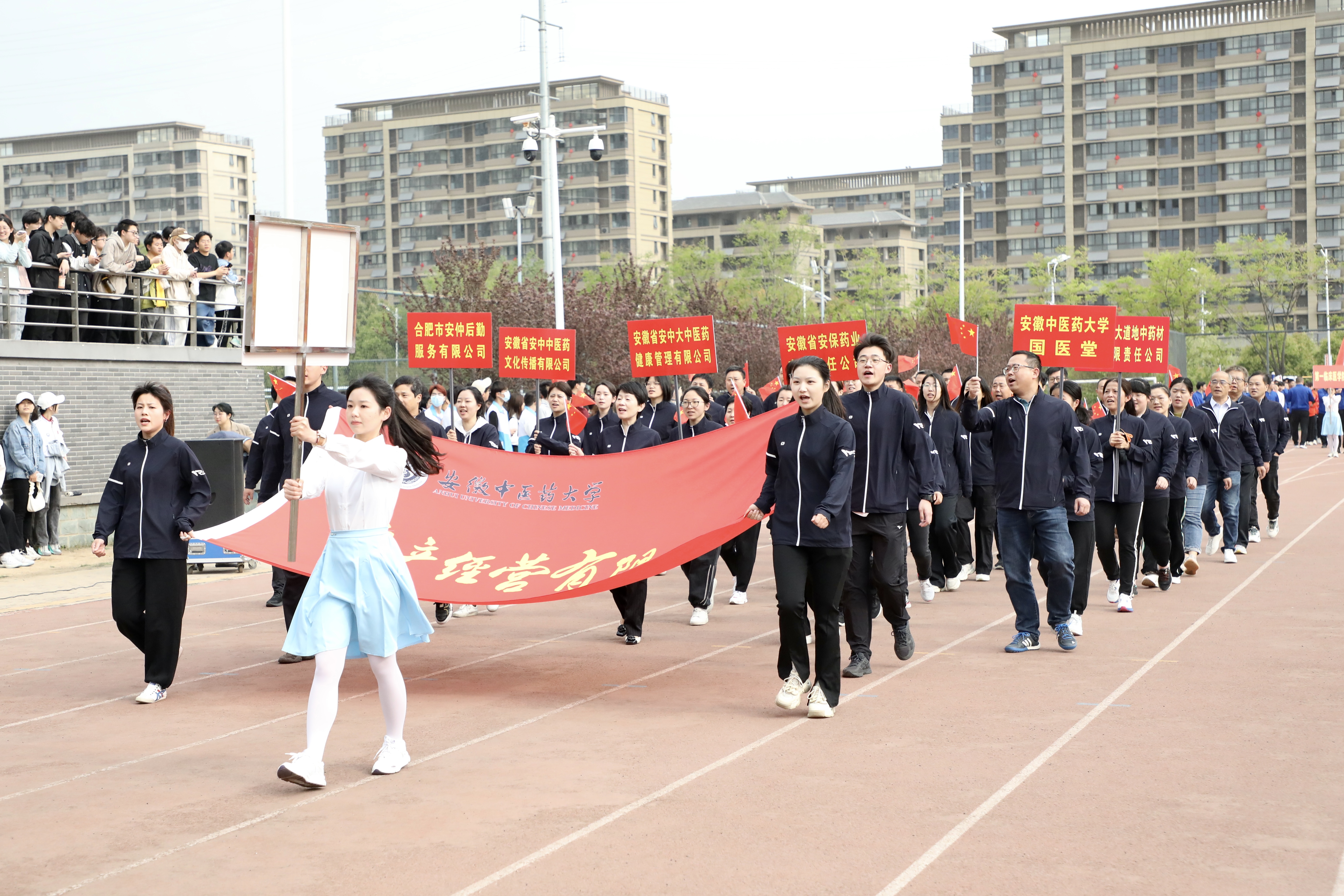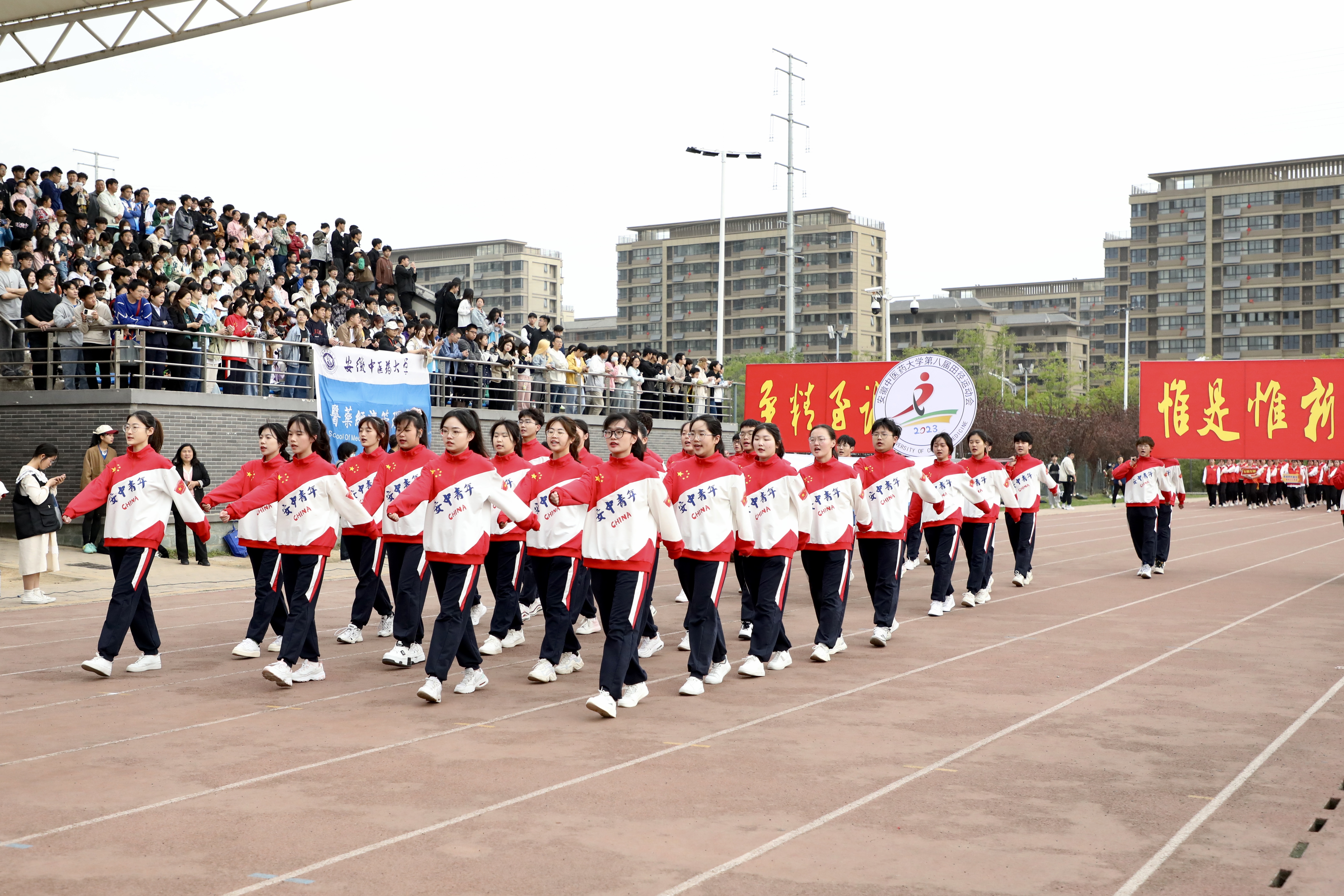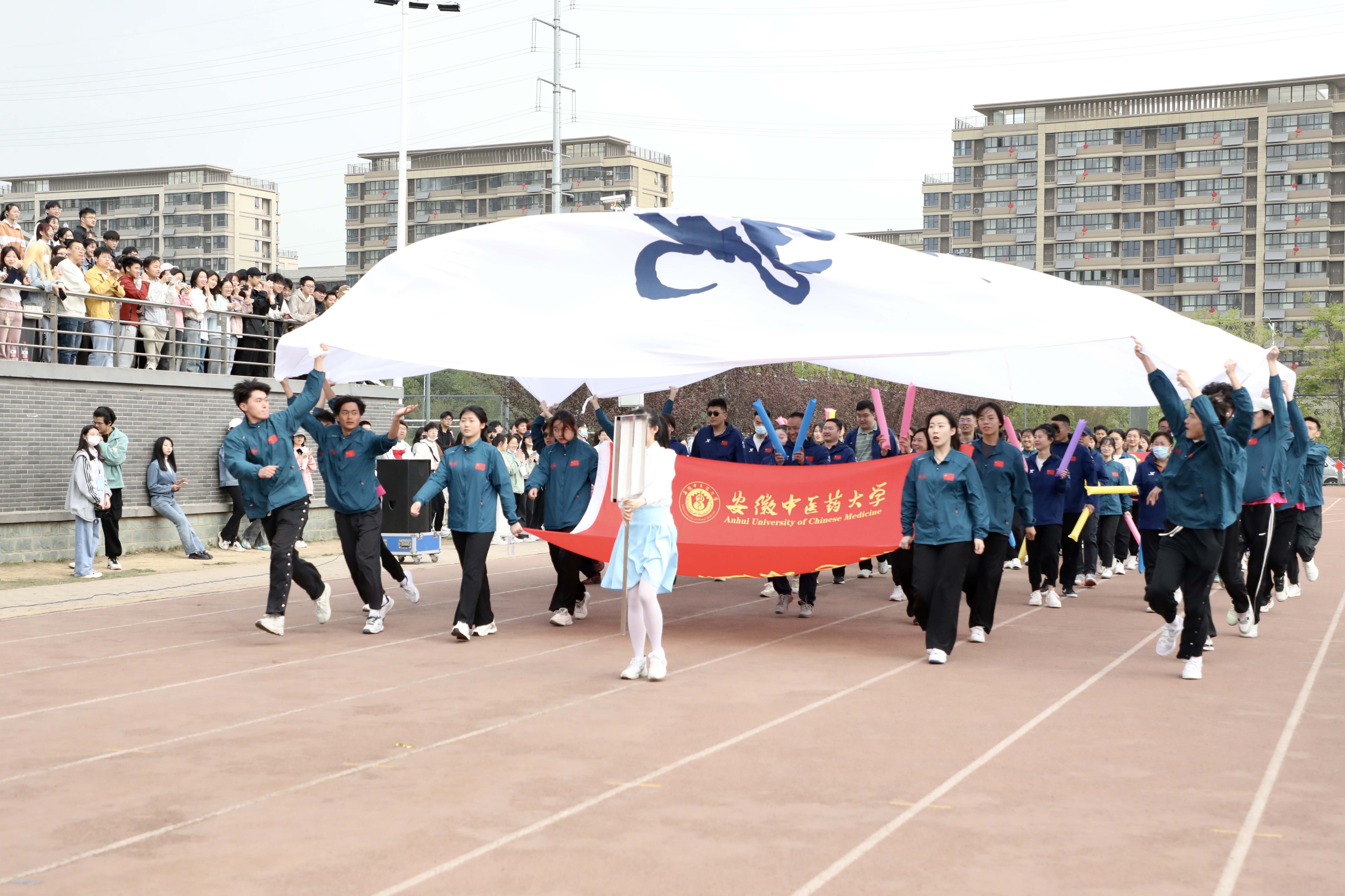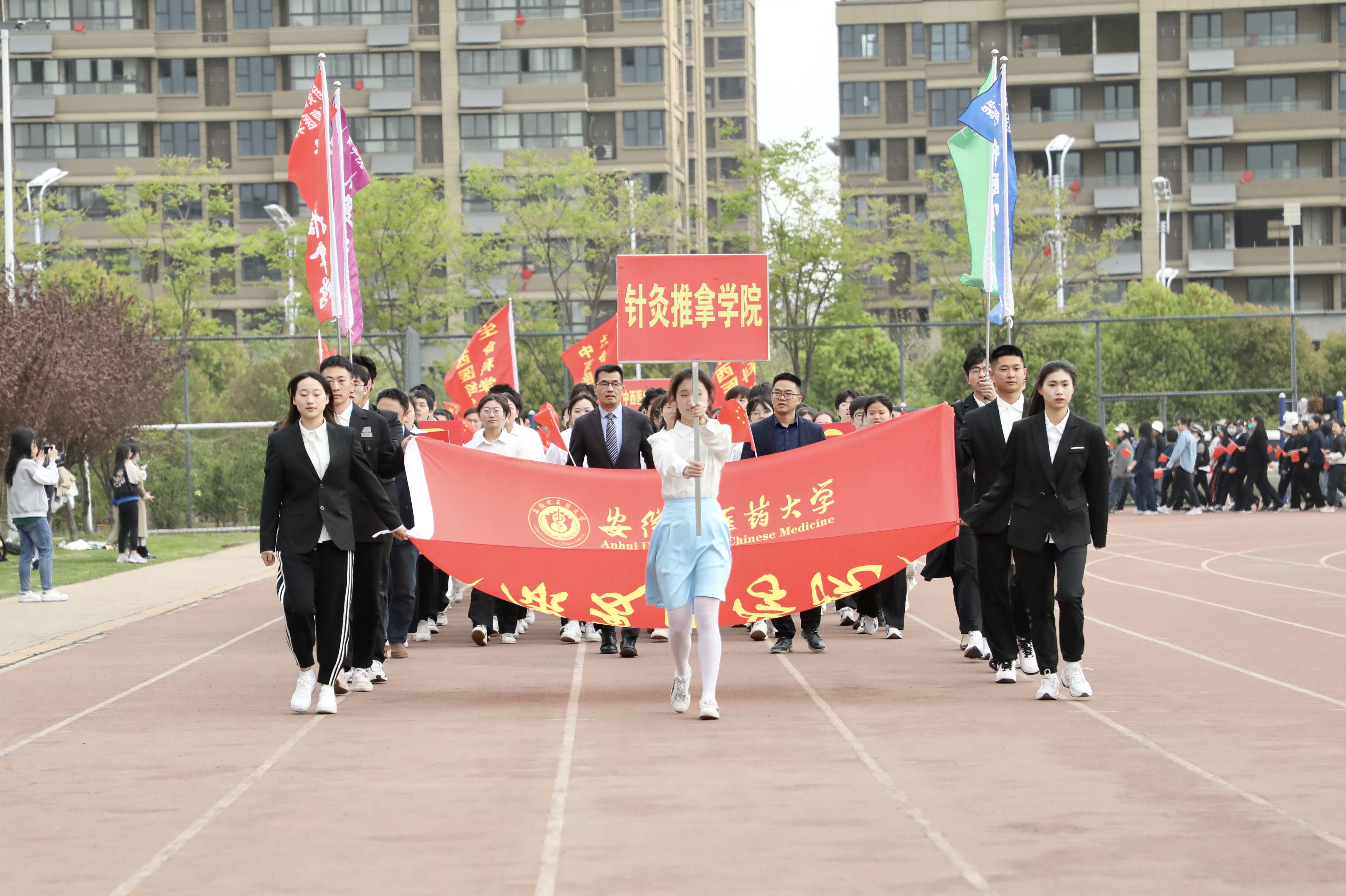 赛场展英姿,团结共拼搏。为深入落实全民健身国家战略,提高全校师生健身意识和健康水平,4月13日上午8时,安徽中医药大学第八届田径运动会在少荃湖校区田径运动场隆重举行。学校党政领导王琦、戴敏、魏骅、许钒、罗绍明、聂久胜、吴达武、田磊及各部门、各学院负责人,全体运动员和各院部代表队参加开幕式。副校长魏骅主持。