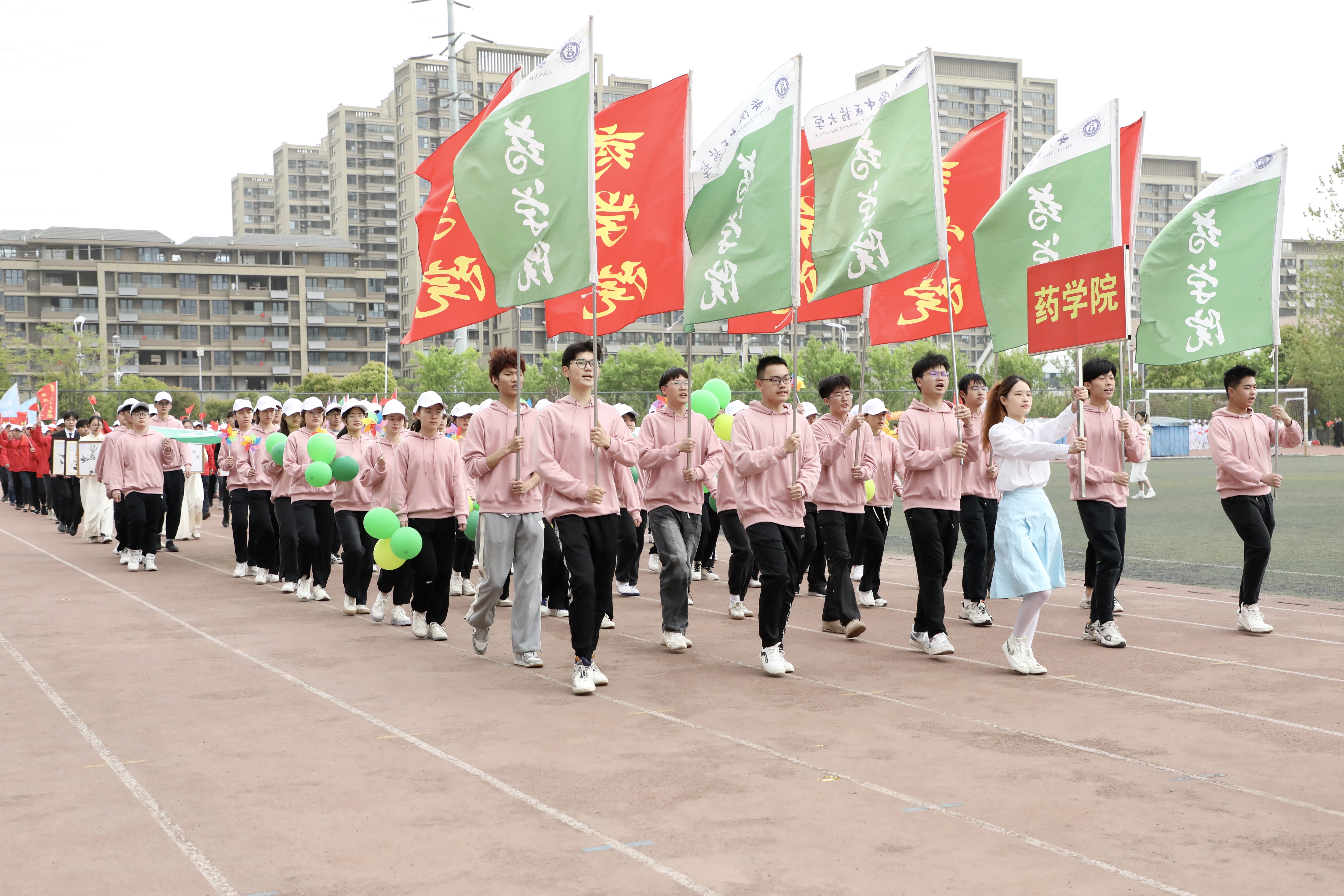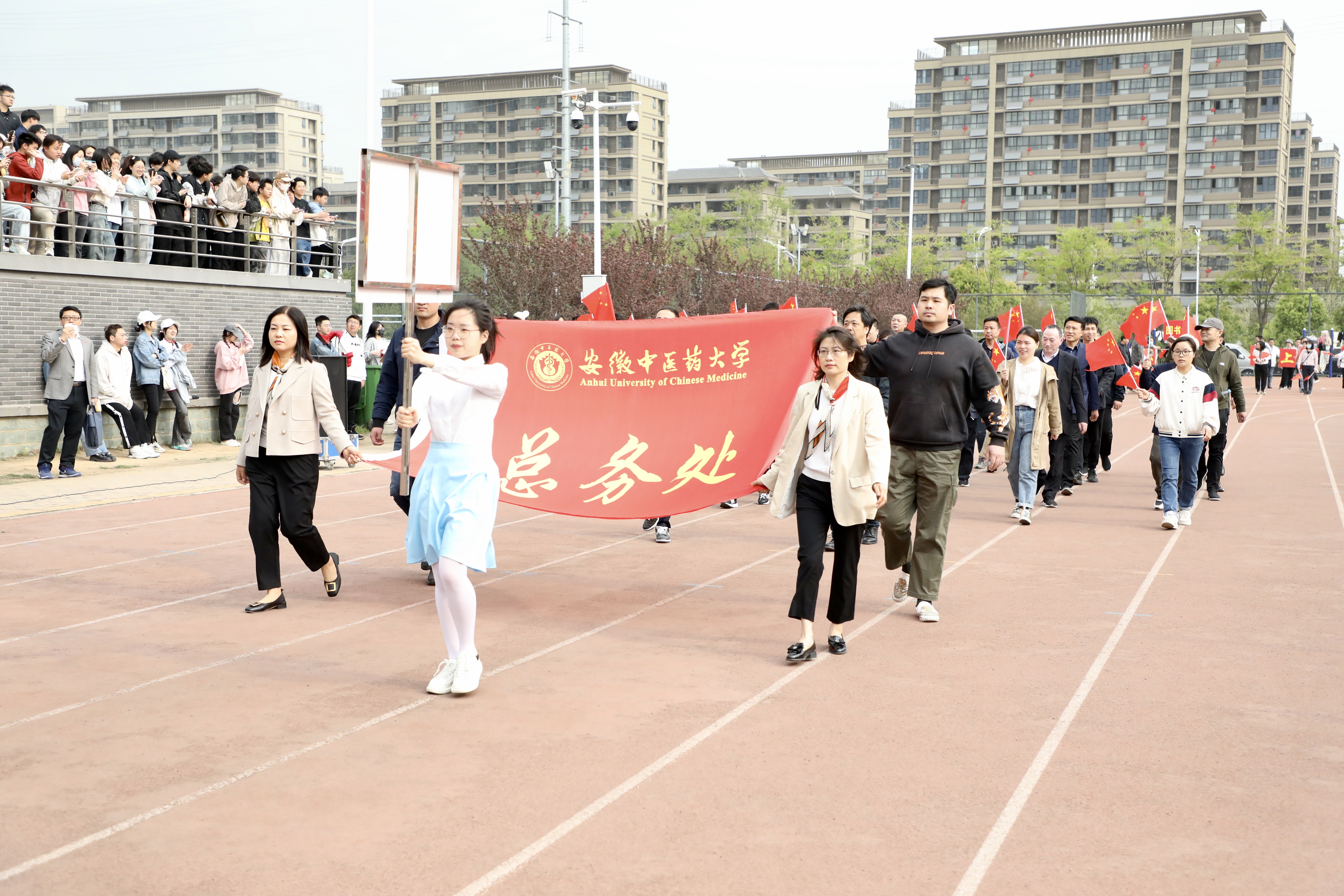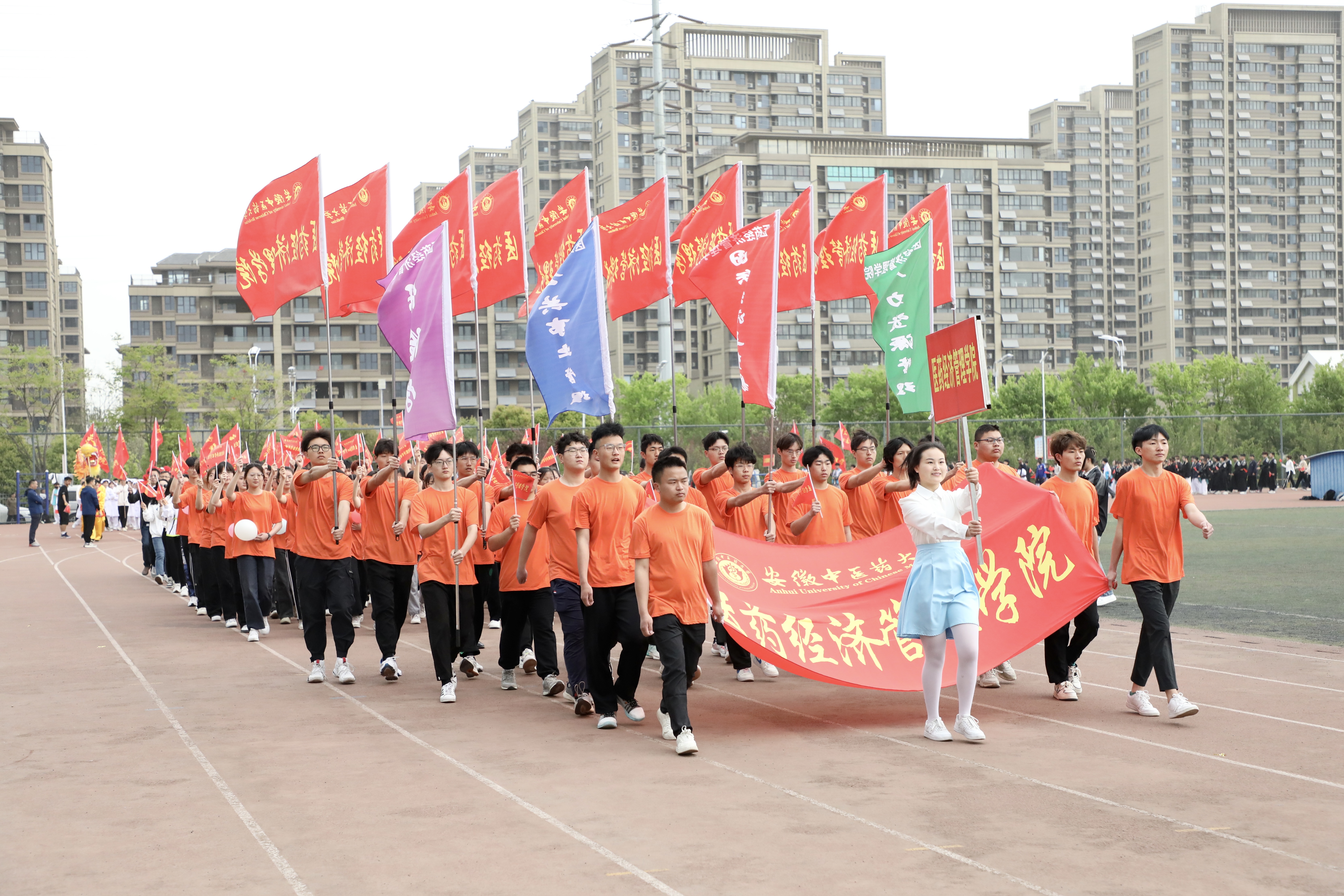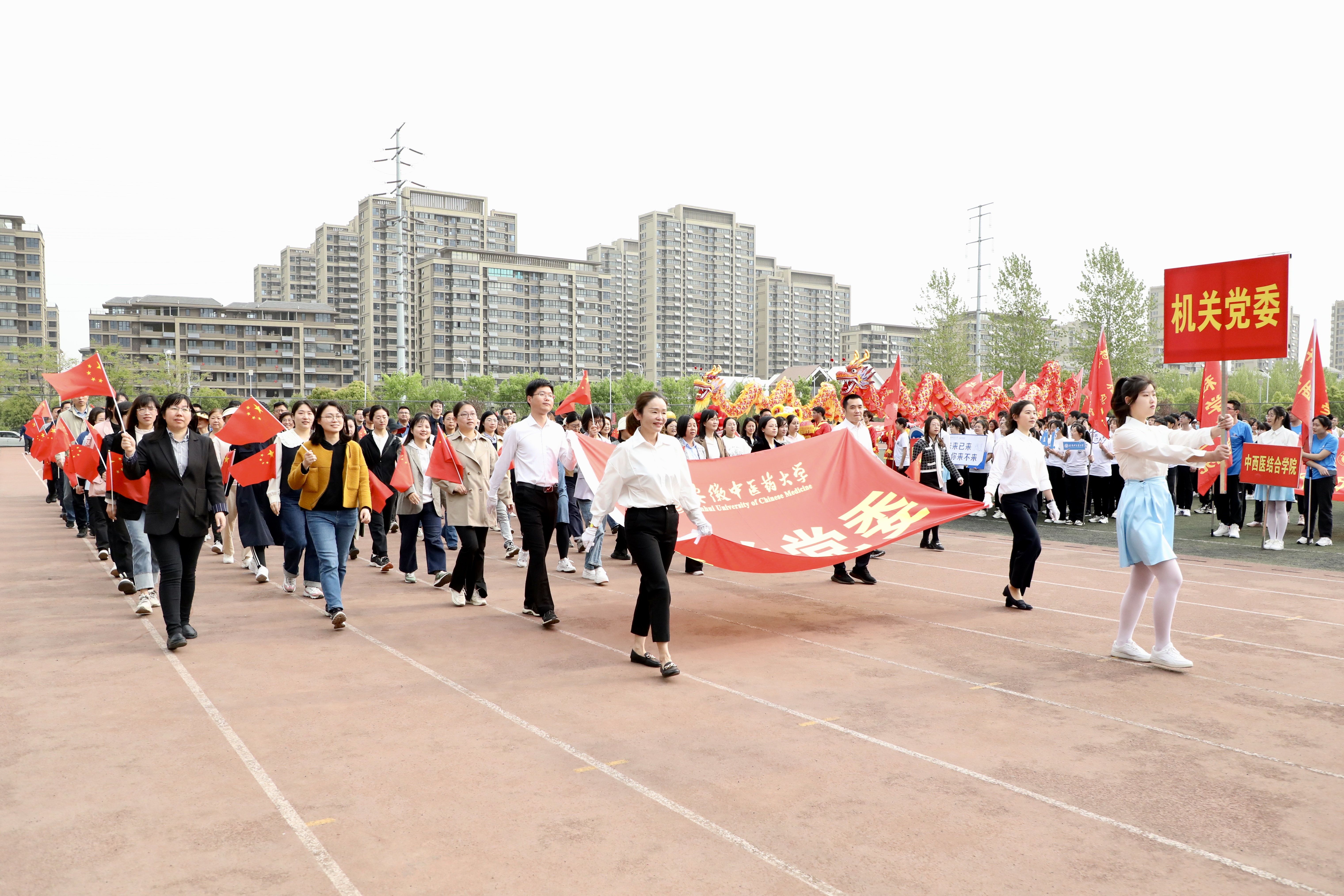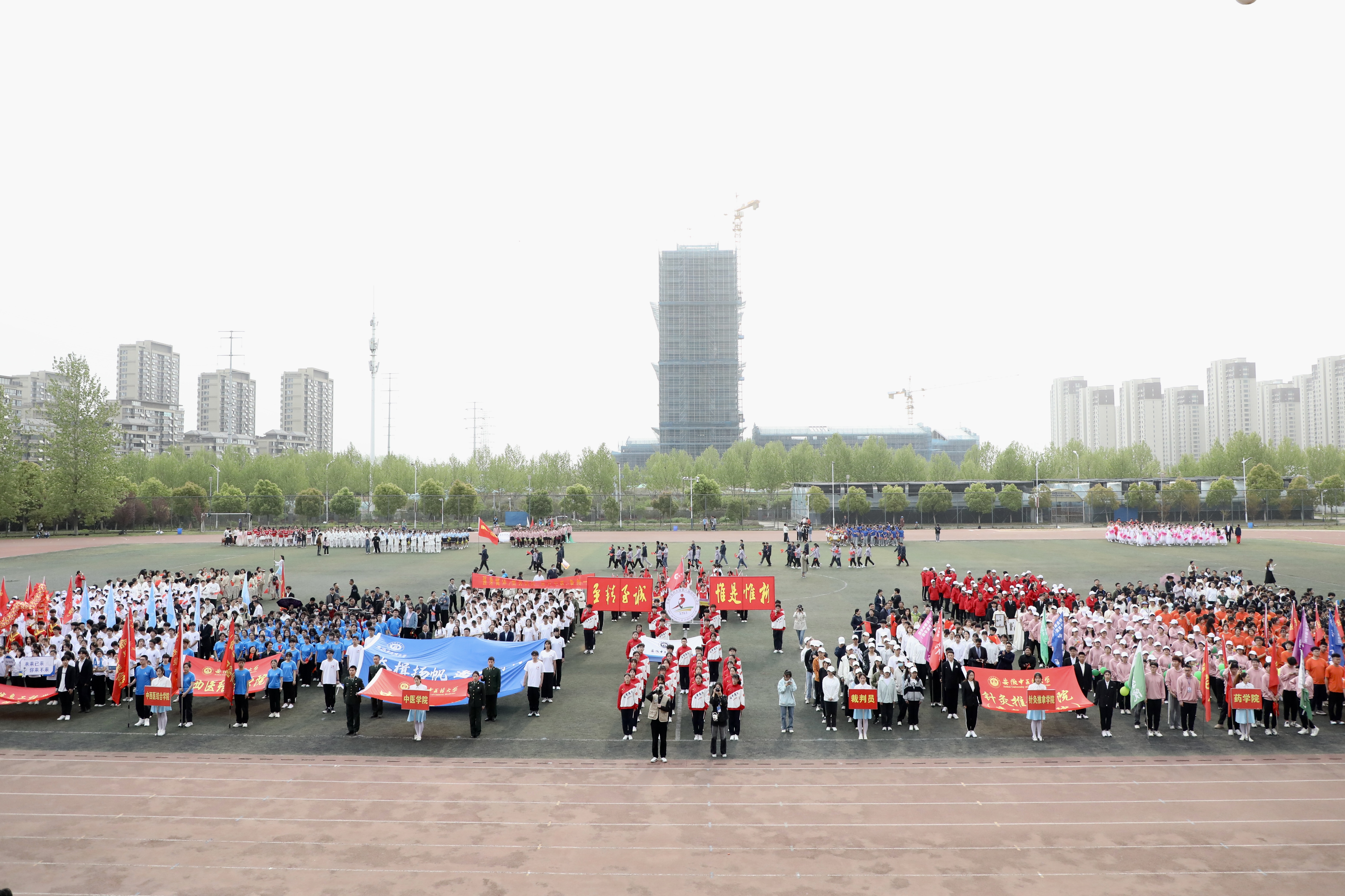 赛场展英姿,团结共拼搏。为深入落实全民健身国家战略,提高全校师生健身意识和健康水平,4月13日上午8时,安徽中医药大学第八届田径运动会在少荃湖校区田径运动场隆重举行。学校党政领导王琦、戴敏、魏骅、许钒、罗绍明、聂久胜、吴达武、田磊及各部门、各学院负责人,全体运动员和各院部代表队参加开幕式。副校长魏骅主持。