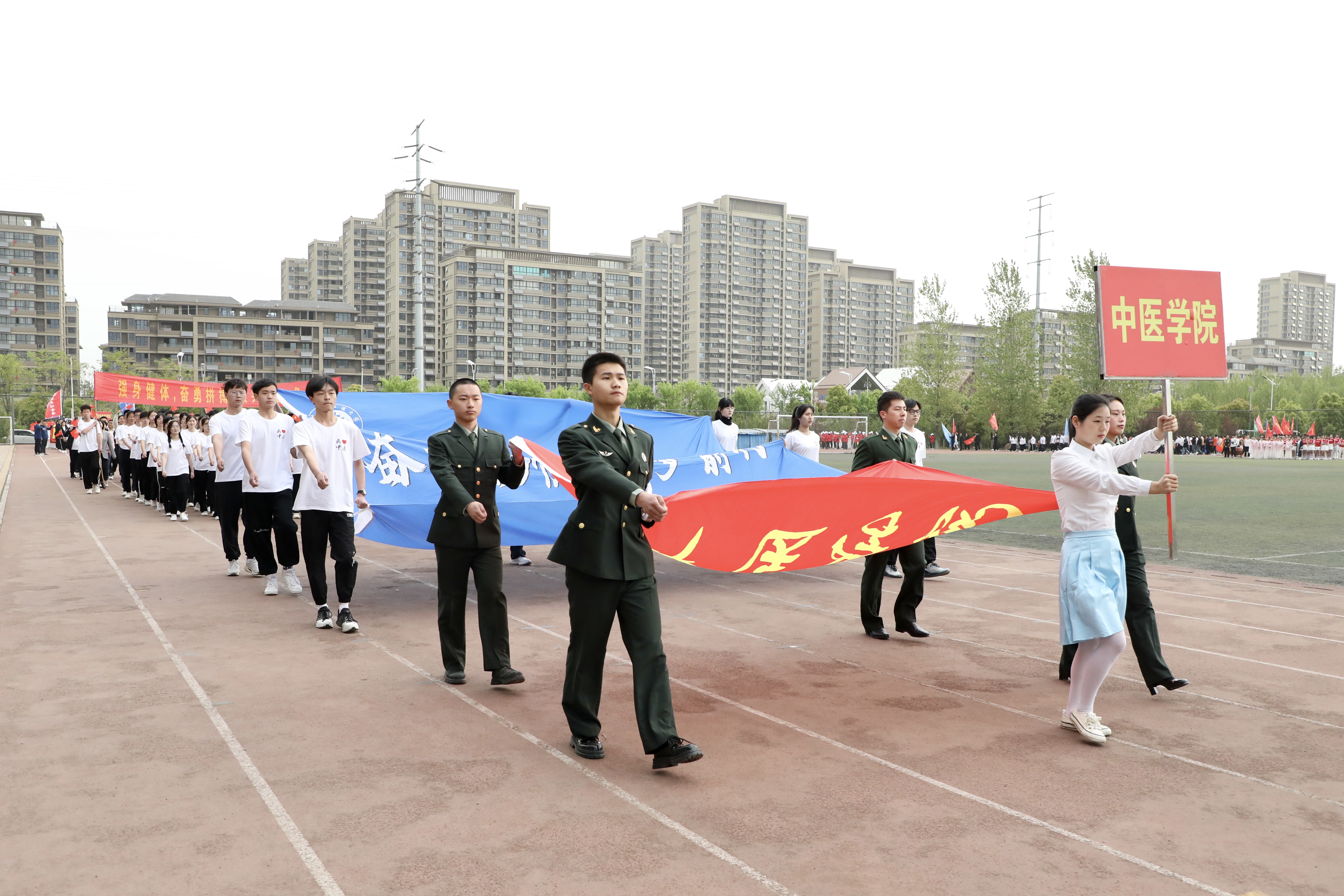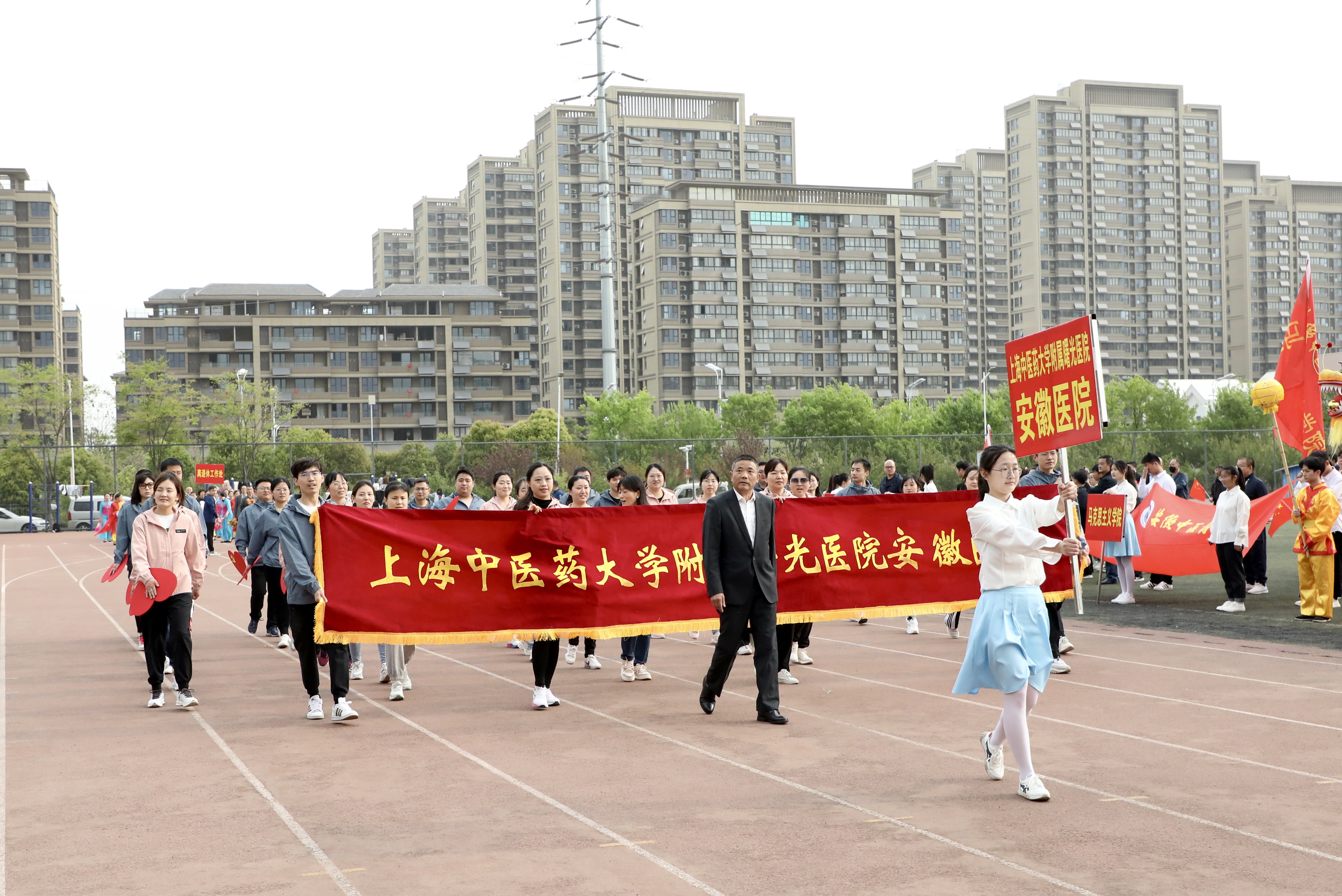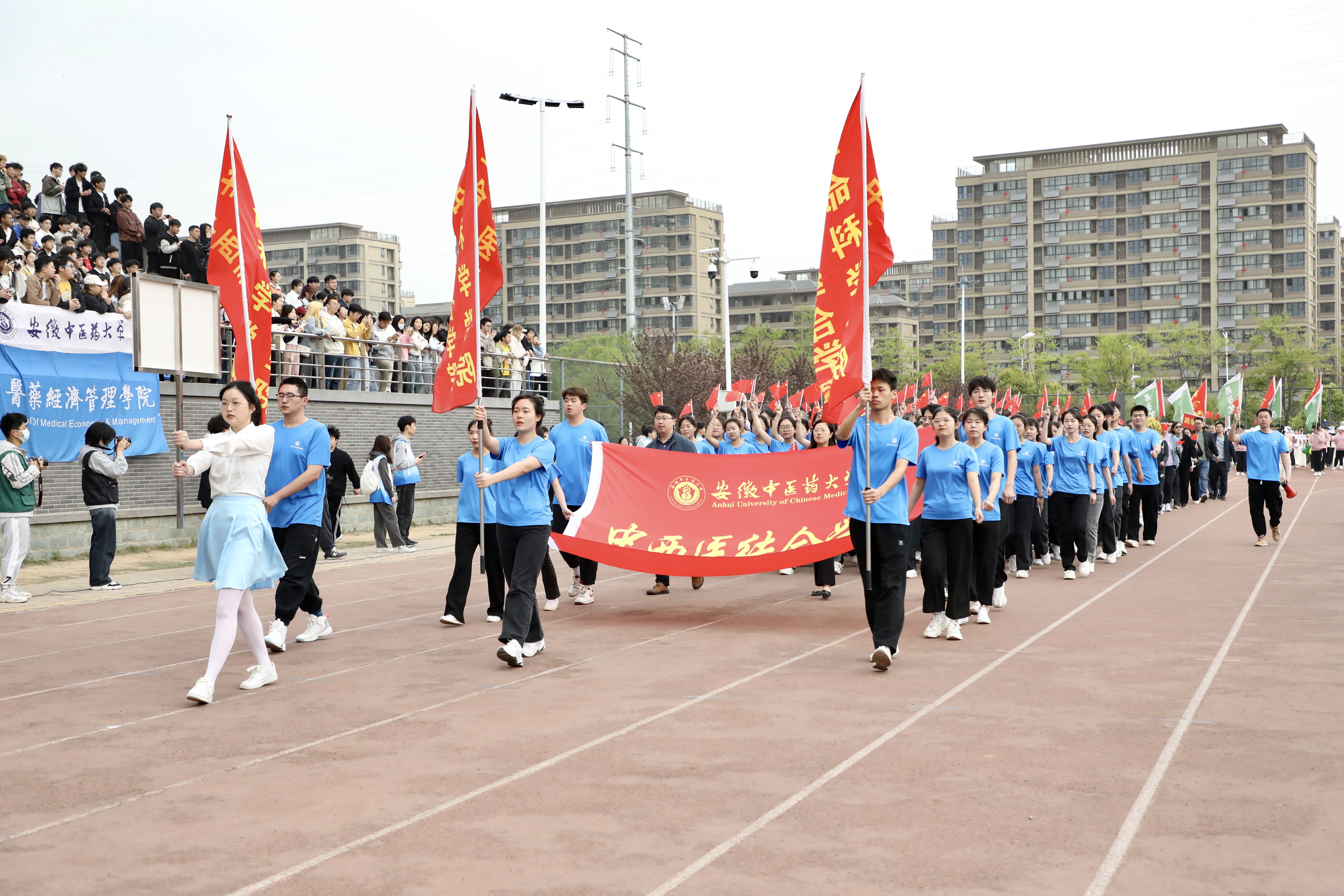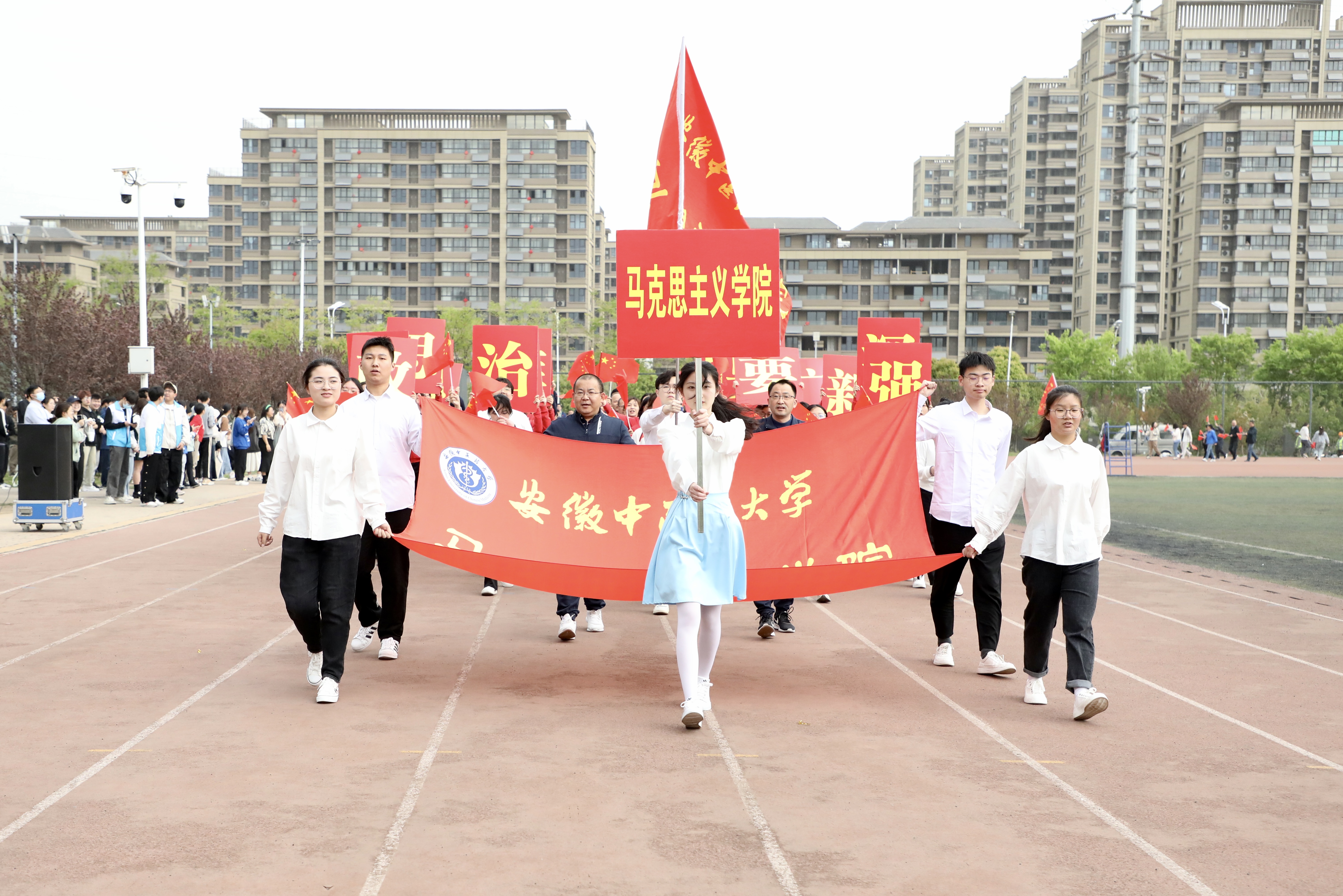 赛场展英姿,团结共拼搏。为深入落实全民健身国家战略,提高全校师生健身意识和健康水平,4月13日上午8时,安徽中医药大学第八届田径运动会在少荃湖校区田径运动场隆重举行。学校党政领导王琦、戴敏、魏骅、许钒、罗绍明、聂久胜、吴达武、田磊及各部门、各学院负责人,全体运动员和各院部代表队参加开幕式。副校长魏骅主持。