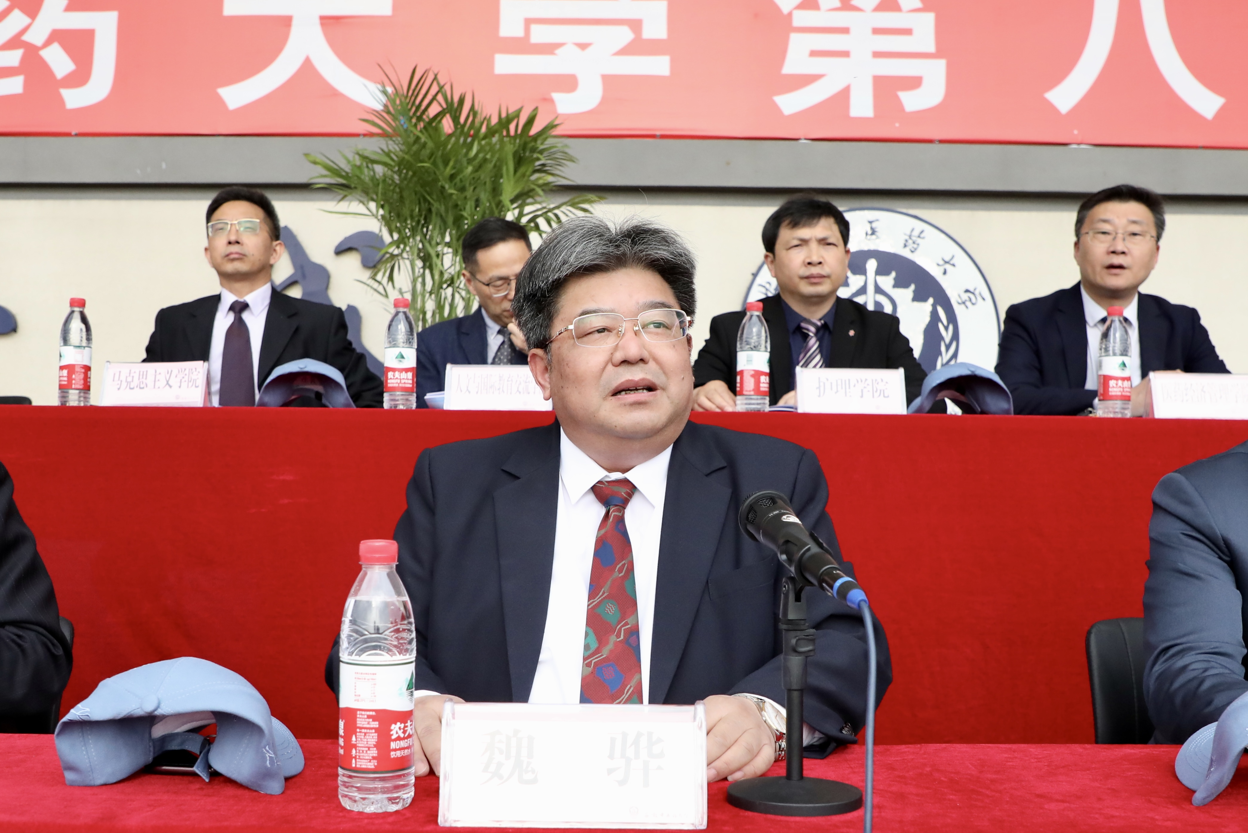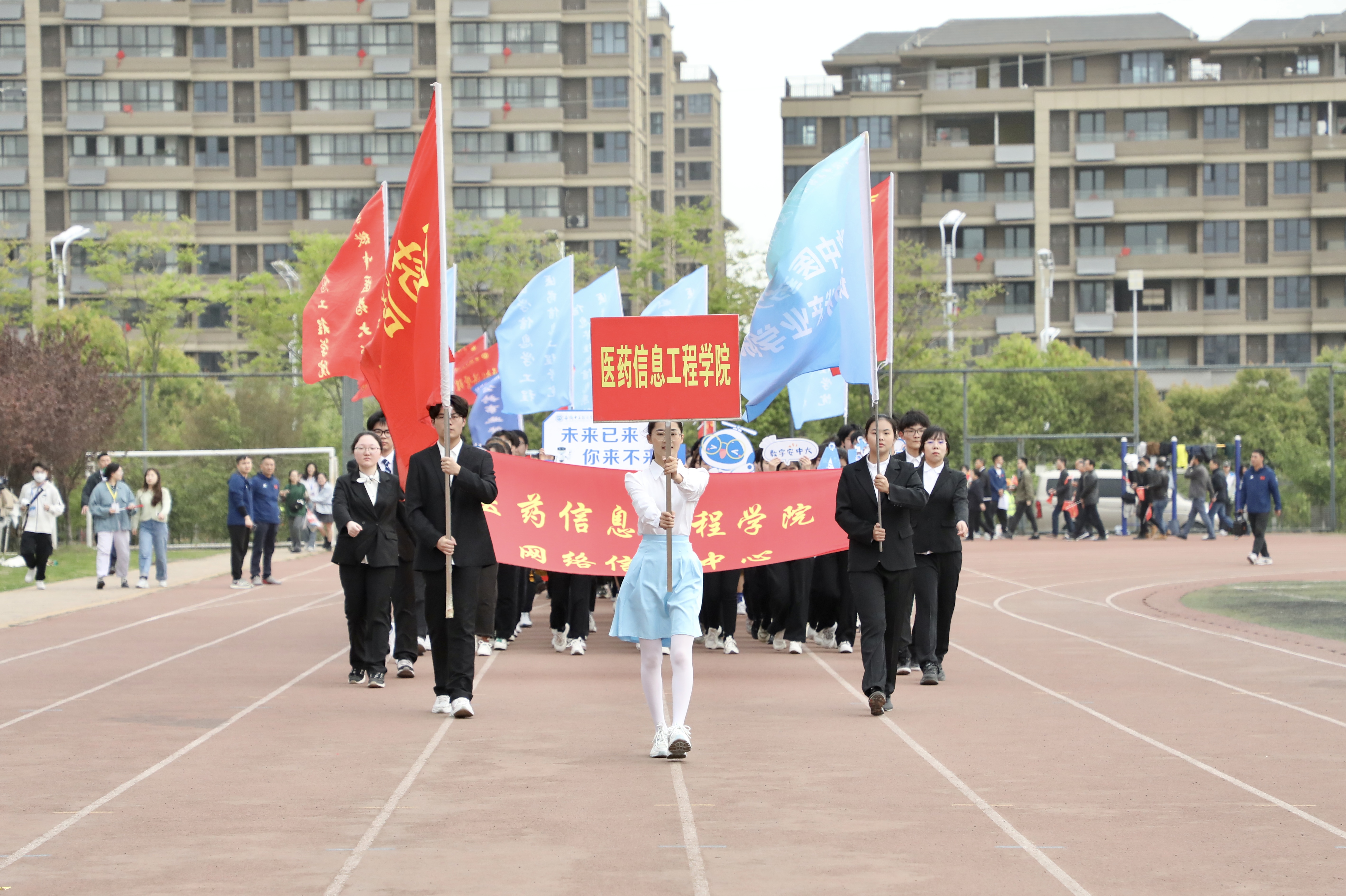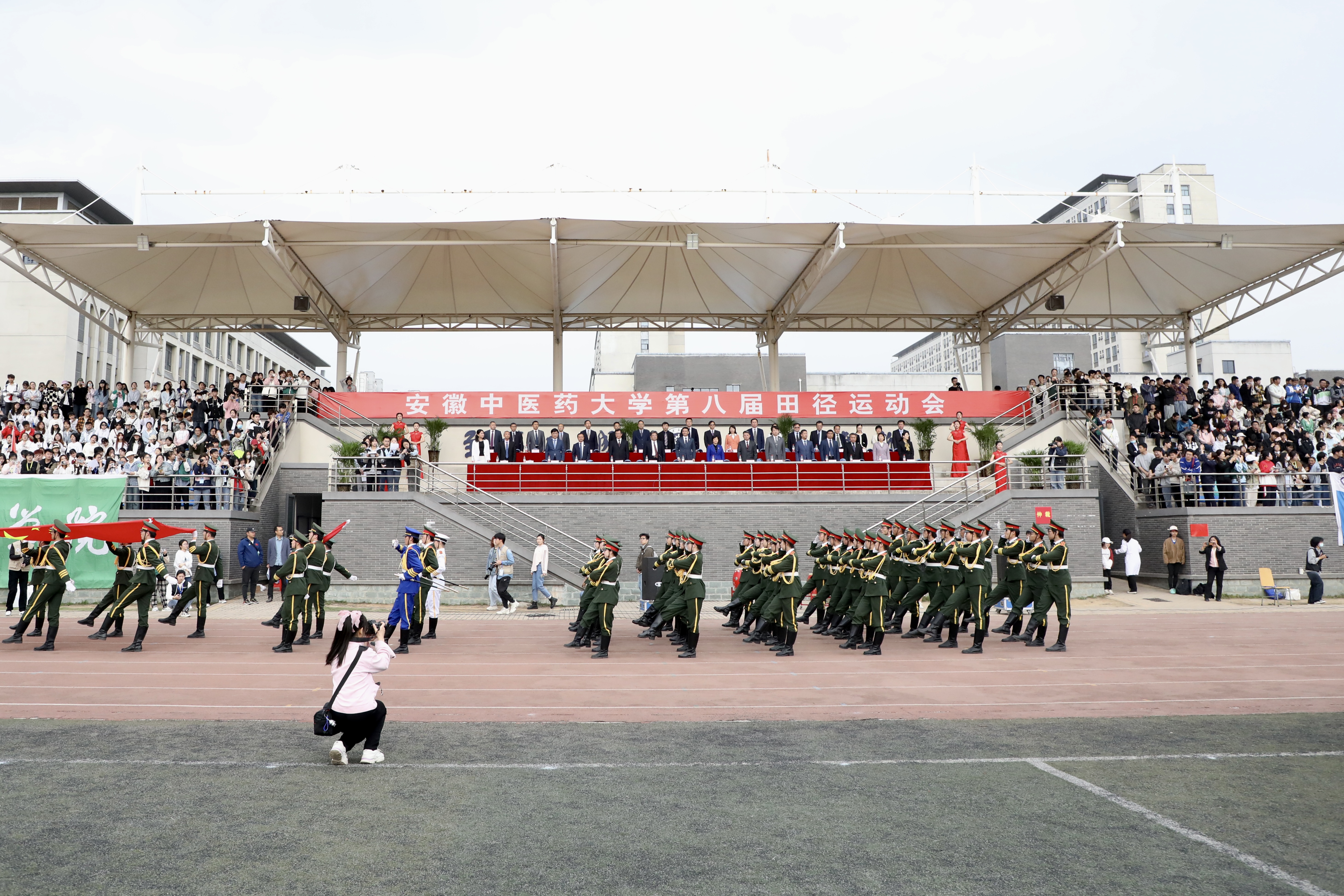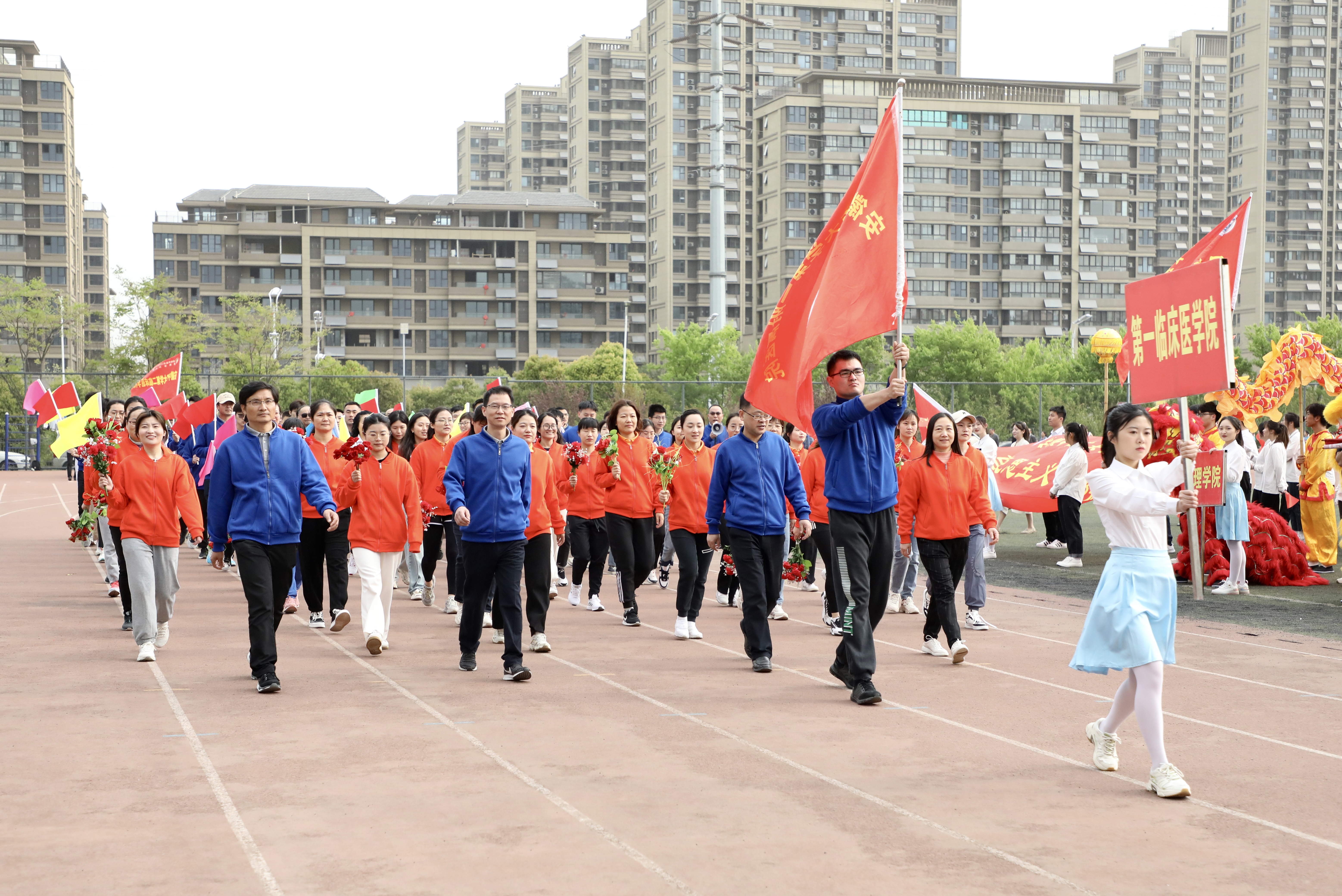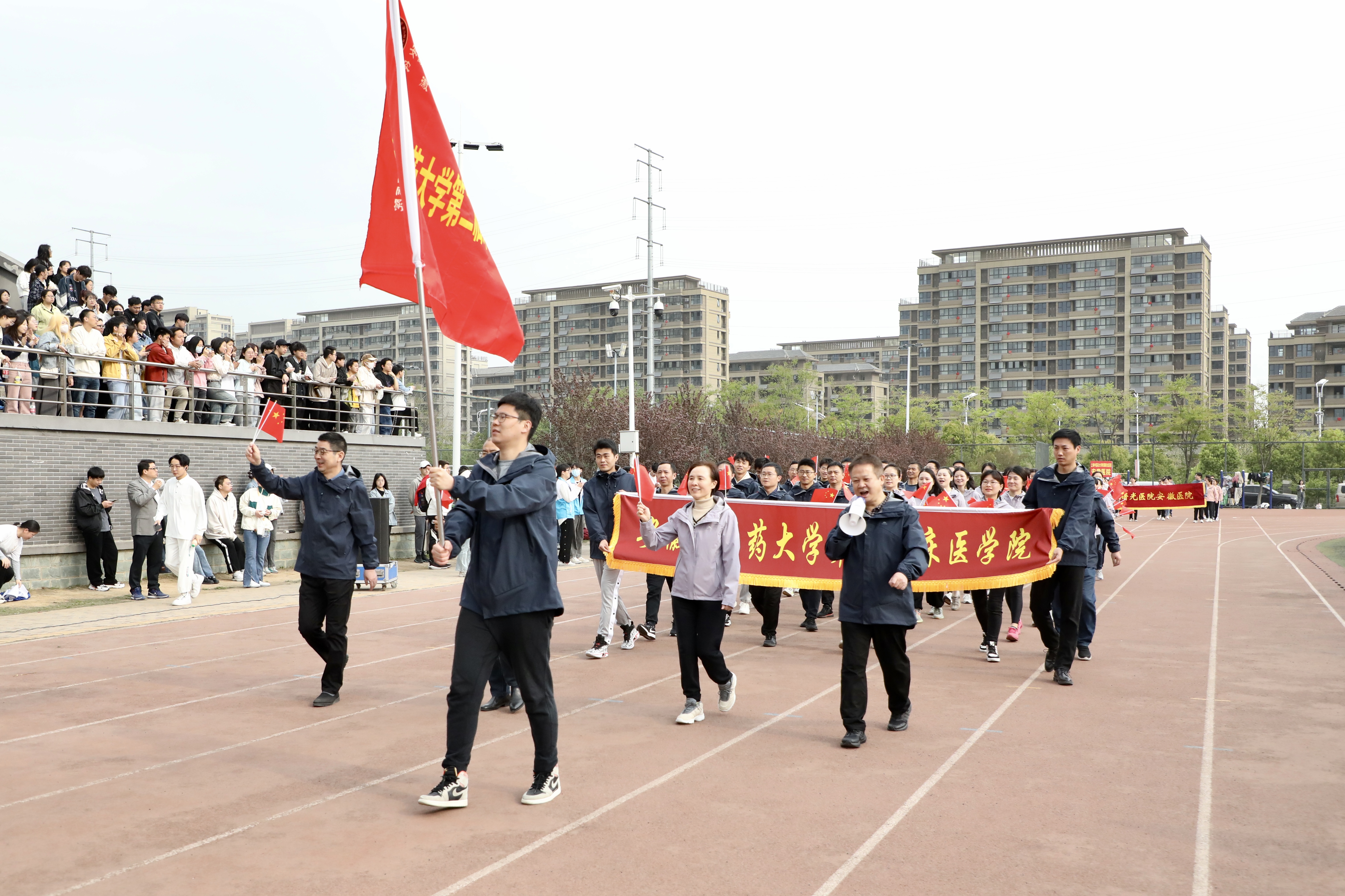 赛场展英姿,团结共拼搏。为深入落实全民健身国家战略,提高全校师生健身意识和健康水平,4月13日上午8时,安徽中医药大学第八届田径运动会在少荃湖校区田径运动场隆重举行。学校党政领导王琦、戴敏、魏骅、许钒、罗绍明、聂久胜、吴达武、田磊及各部门、各学院负责人,全体运动员和各院部代表队参加开幕式。副校长魏骅主持。