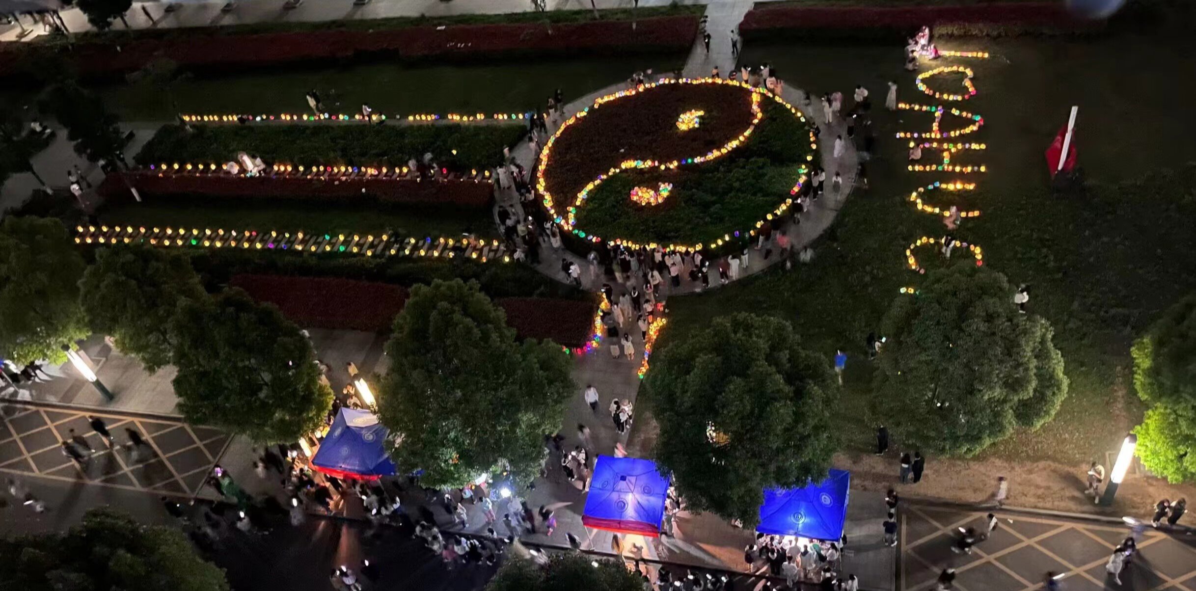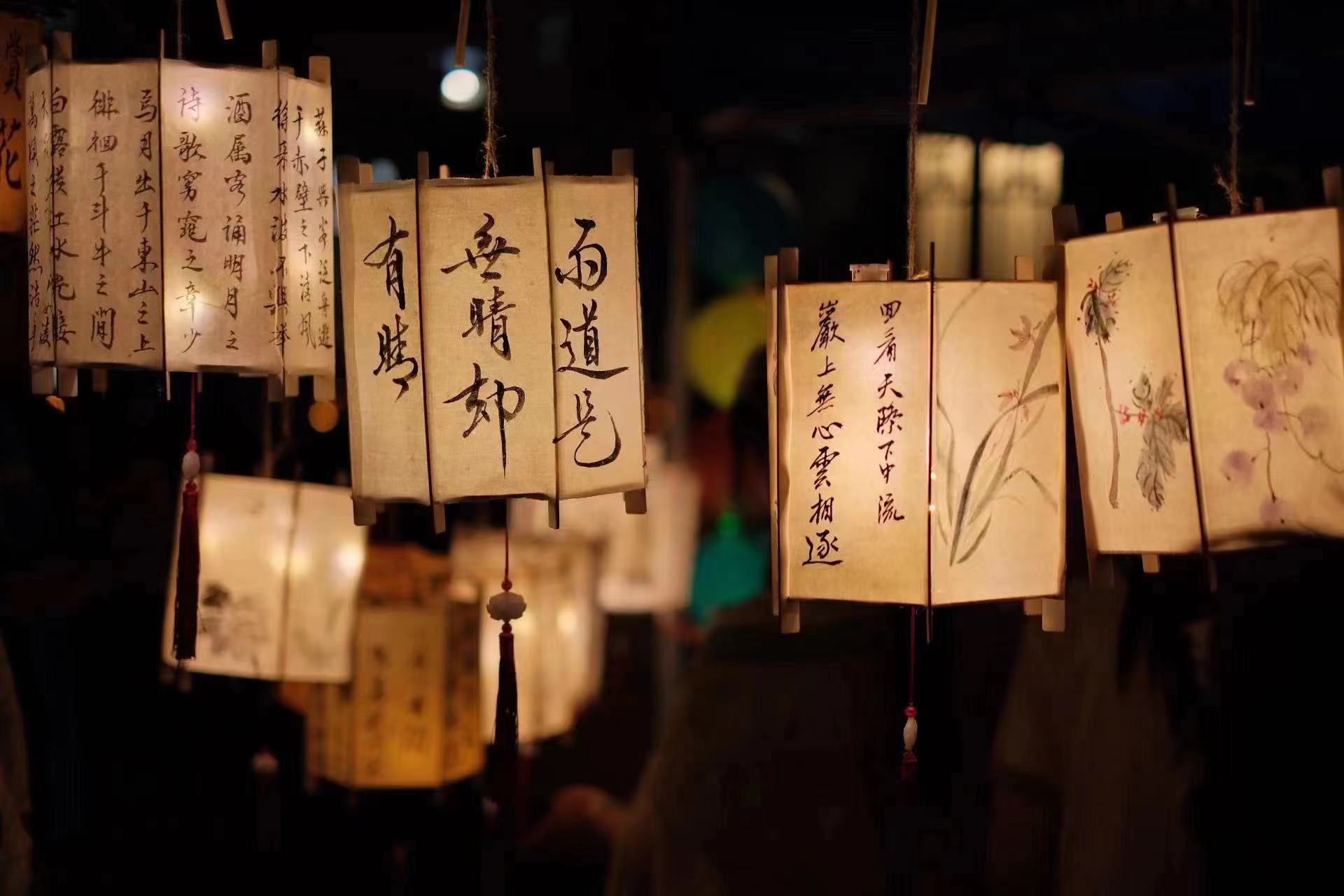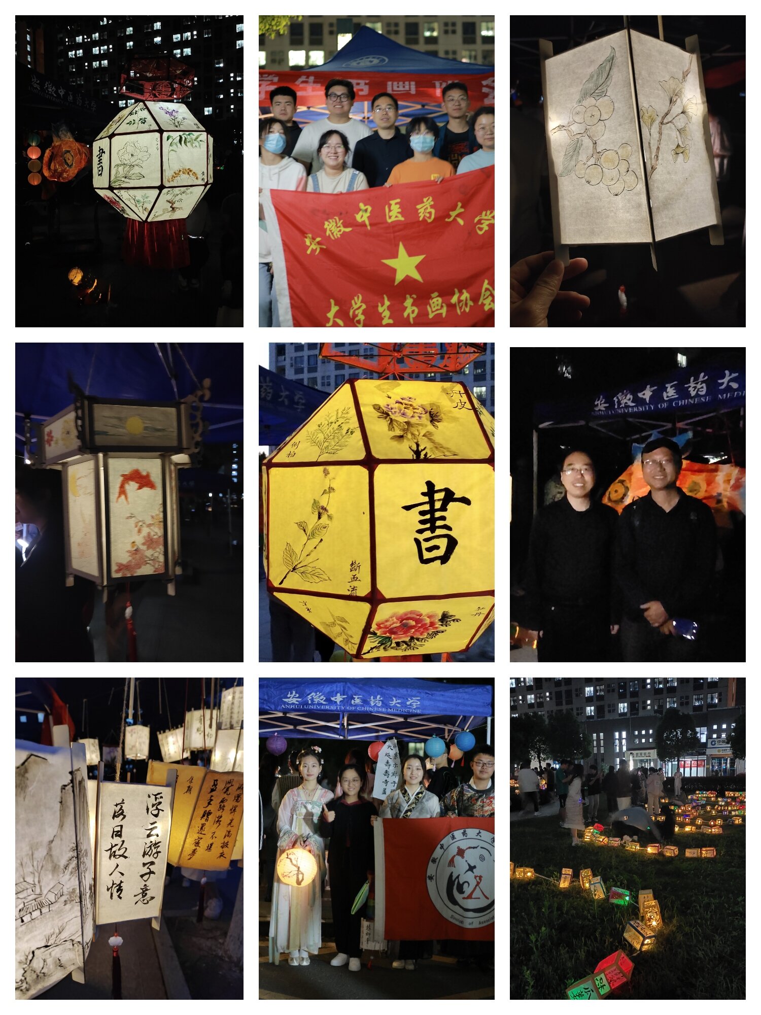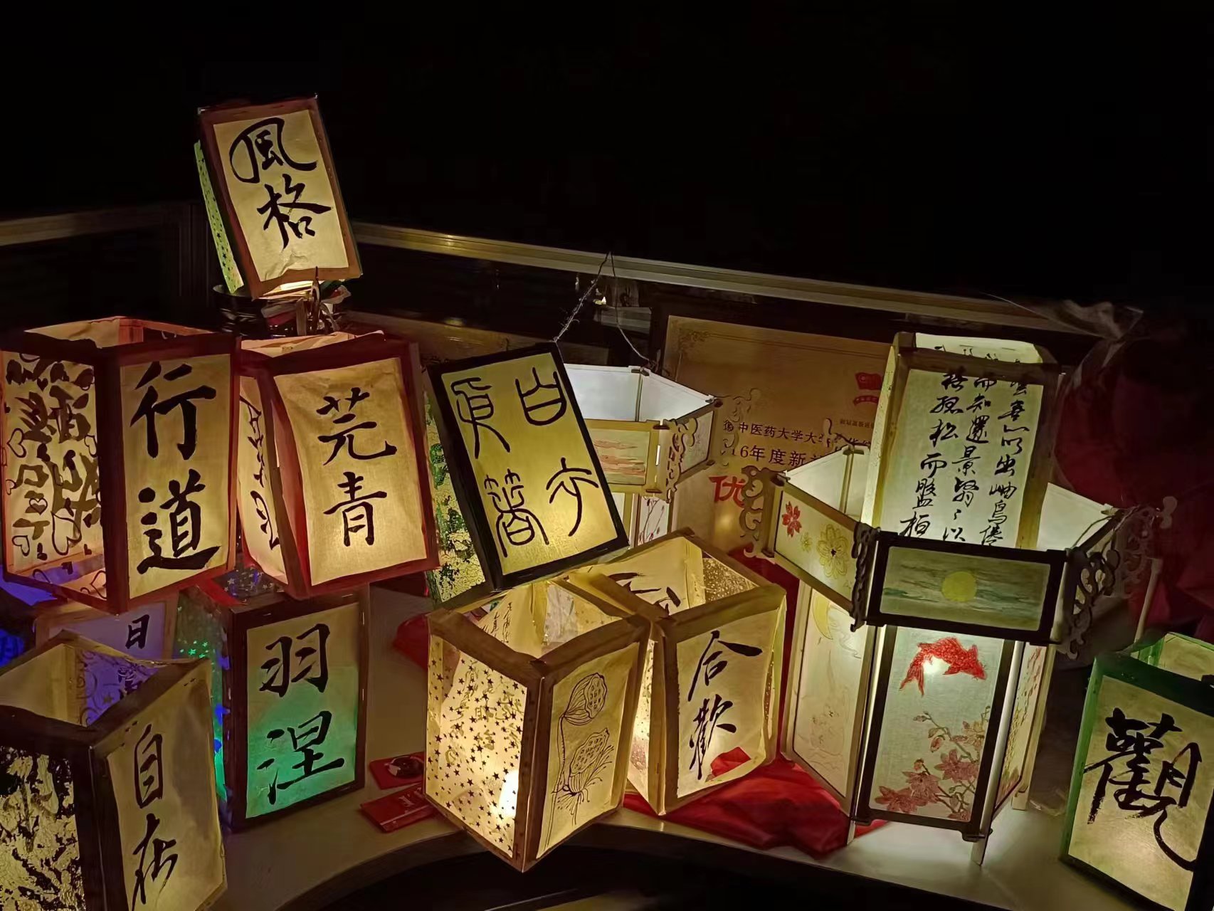 太极花园夜,美月盈空,银波碧玉三千里,星河散尽,万千灯火落校园。展示花灯分为宣纸花灯、砂纸花灯、剪纸花灯等,由艺术俱乐部联合学生社团历时一个月制作而成。