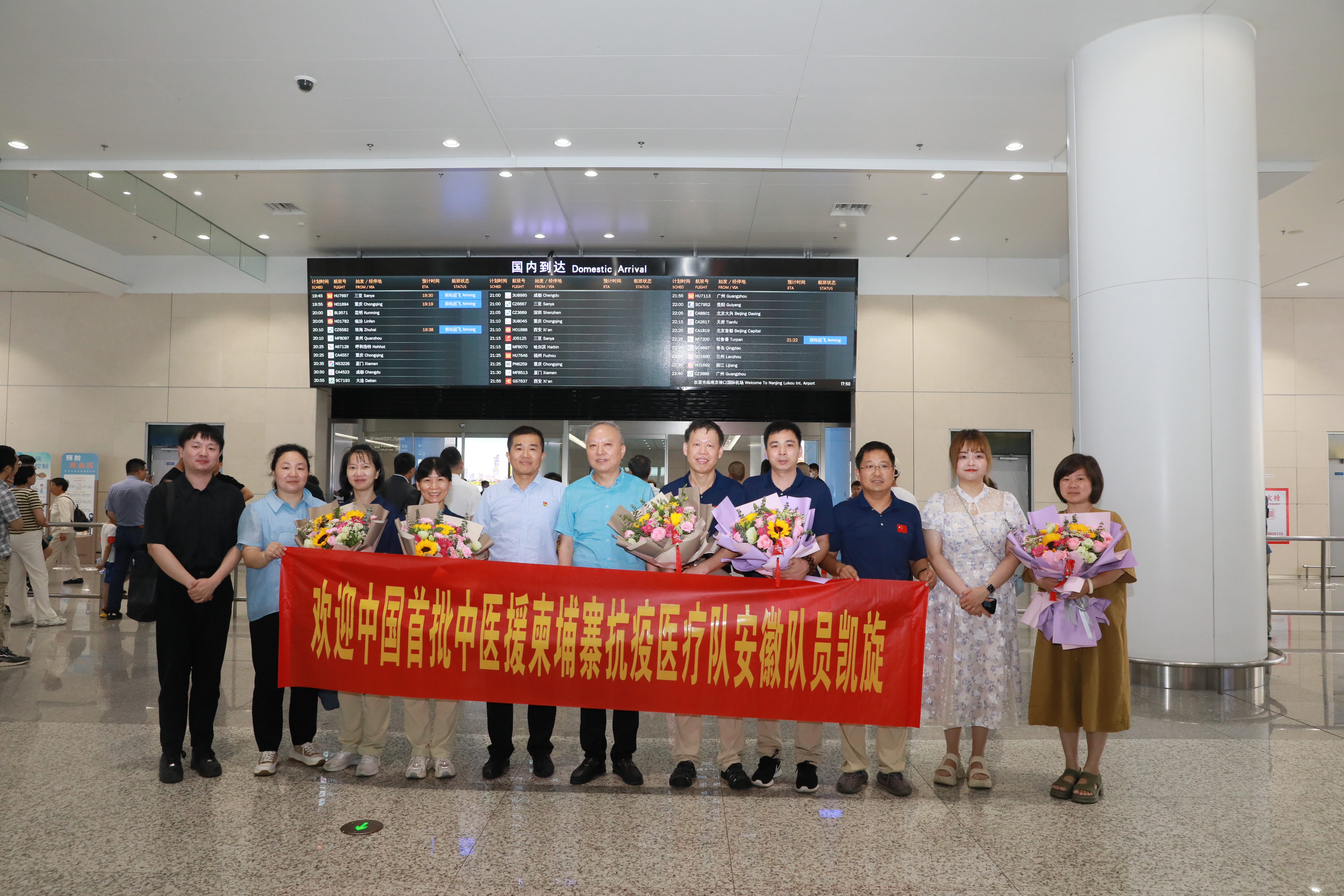 7月1日,正值中国共产党成立102周年,当天,由学校第二附属医院(安徽省针灸医院)派出的5名医生中国首批中医援柬埔寨抗疫医疗队安徽队员,圆满完成为期1年的医疗援助任务载誉归来,抵达南京禄口国际机场。安徽省卫生援外办主任杜昌勇、第二附属医院党委书记雷黎等到机场迎接。