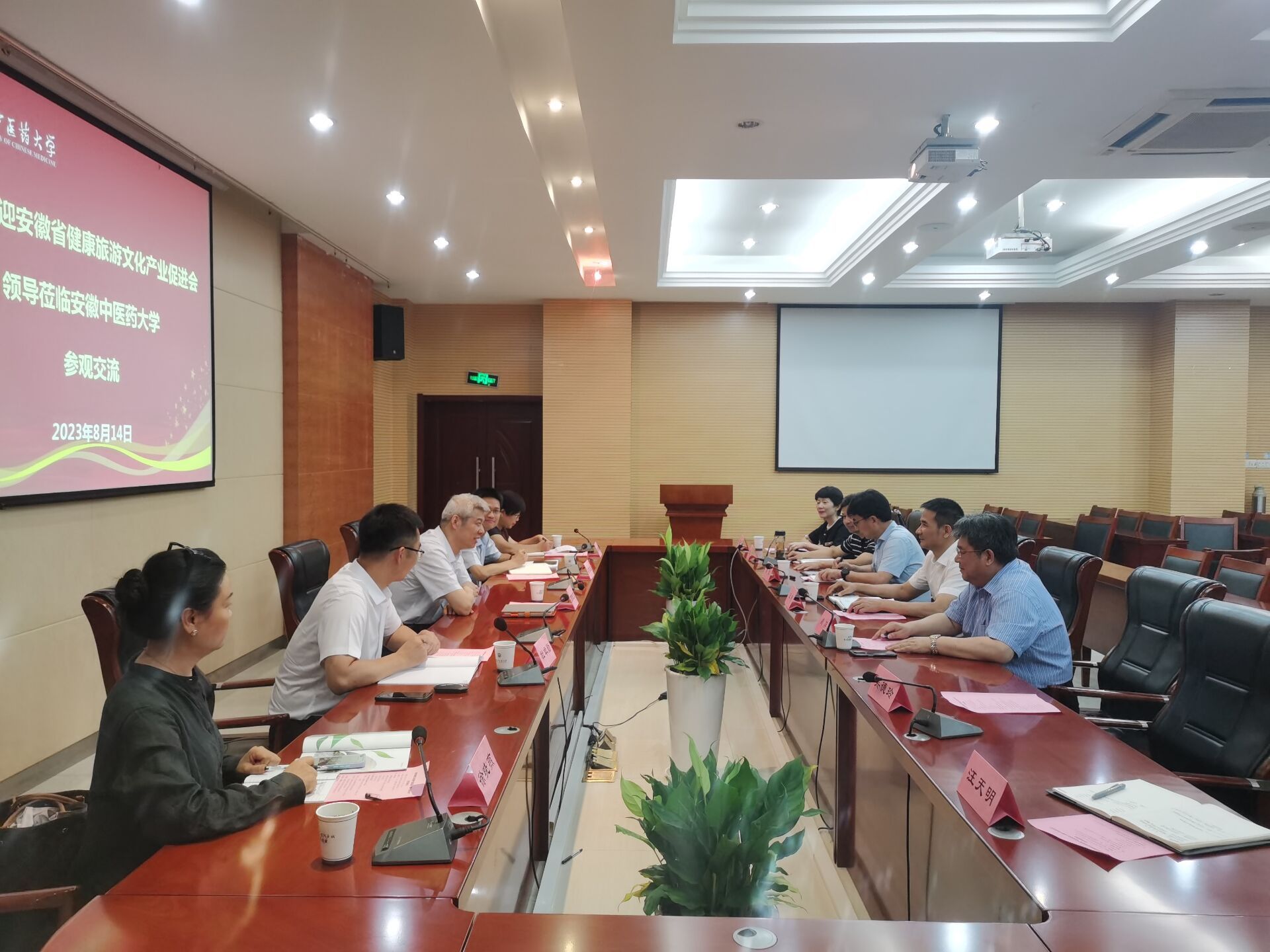8月14日下午,安徽省健康文化旅游产业促进会会长高俊文、省卫生健康委中医药发展处副处长吴化成等一行来校进行座谈交流,学校党委书记王琦,党委常委、副校长魏骅等热情接待促进会一行,学校办公室主任胡波、科技处处长吴德玲、资产经营有限公司党总支书记张亚辉等相关部门负责人同志参加座谈。
