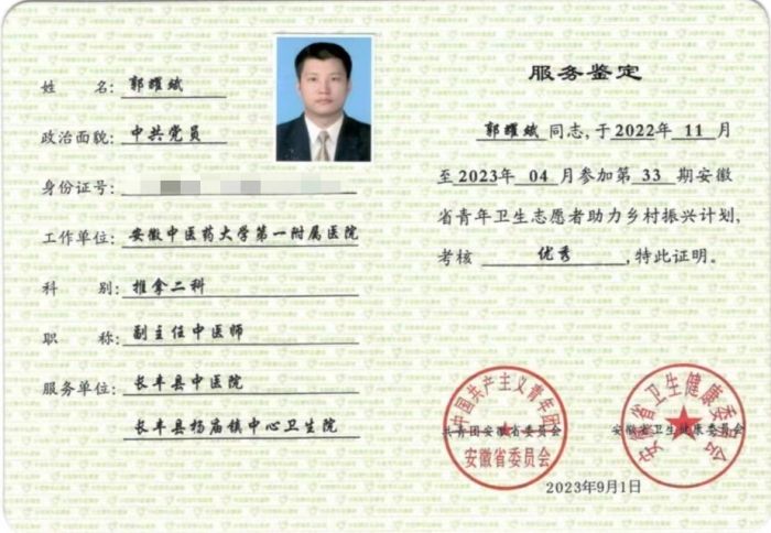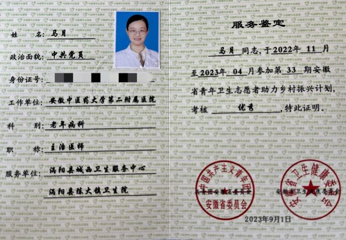 此外,第33期青年卫生志愿者、第一临床医学院推拿科青年医师郭耀斌和第二临床医学院老年病二科青年医师马月获得第33期安徽省青年卫生志愿者考核“优秀”等次。