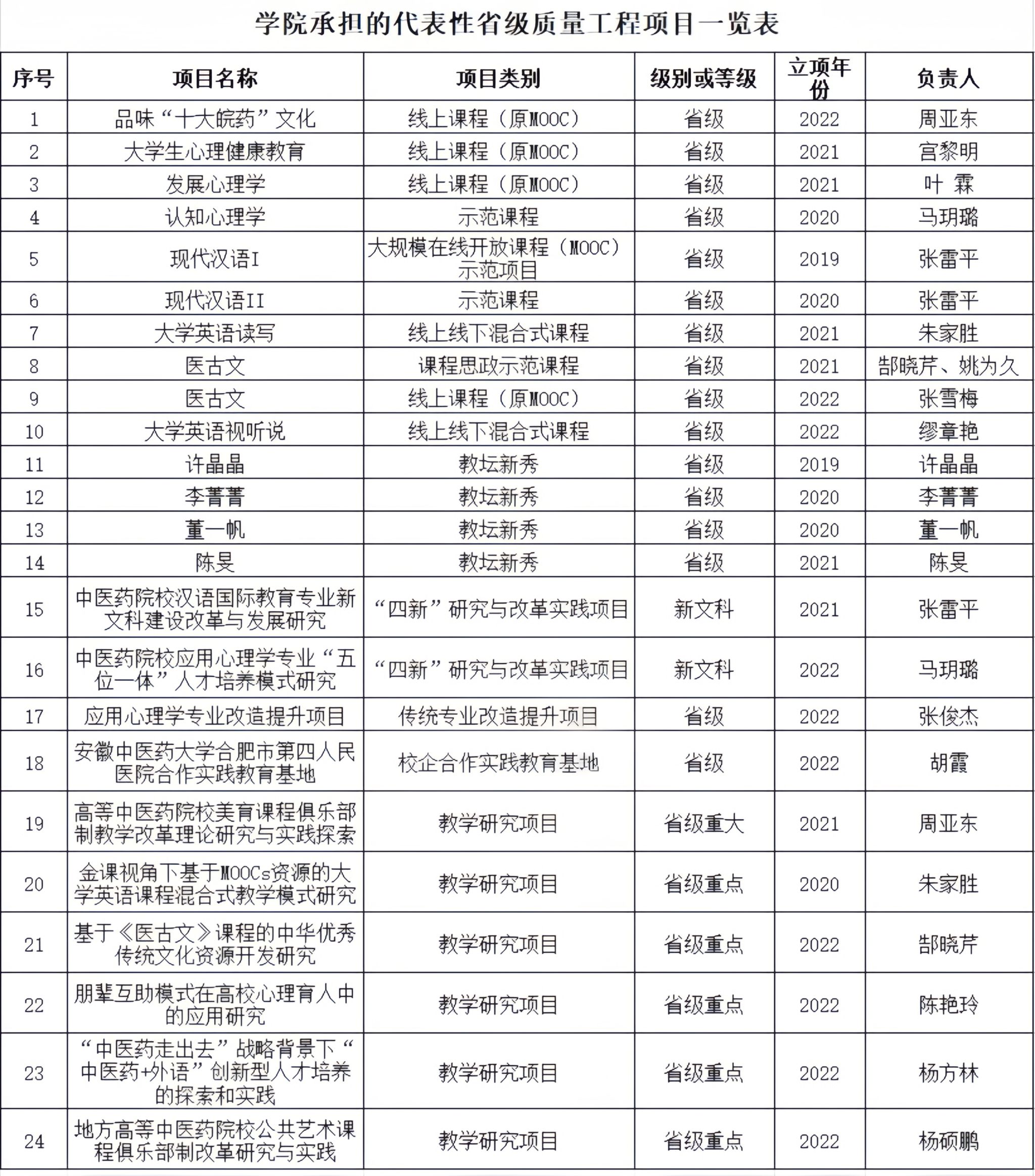 ——加强省级一流本科专业建设。学院应用心理学是安徽省一流本科专业建设点,专业开设于2001年,是教育部批准的首批设置应用心理学本科专业的9所医学院校之一,距今办学已有22年历史。汉语国际教育专业是安徽省一流本科专业建设点,专业开设于2010年;2011年获批中医文化学硕士点授权建设单位,2012年中医文化学被评为国家中医药管理局重点学科,2013年开始招收中医文化学研究生。依托2个省级一流本科专业,积极申报国际中文教育、应用心理硕士专业学位授权点。修订应用心理学专业和汉语国际教育人才培养方案。心理学系获批教育部“长三角高校公共心理学课程虚拟教研室”协作建设单位,获得安徽省教学成果奖二等奖1项。学校入选安徽省心理健康教育教材基地、入选安徽省中小学教材基地,心理咨询中心通过安徽省教育厅评估被正式授予“安徽省高校心理健康教育与咨询示范中心”。汉语国际教育专业学生2022年获得安徽省首届国际中文教学微课大赛一等奖1项,二等奖1项,三等奖3项,优秀奖1项;2023年获得“挑战杯”安徽省大学生课外学术科技作品竞赛一等奖(入围国赛);入选2023年“推普助力乡村振兴”全国大学生暑期社会实践志愿服务活动团队(安徽省有51支团队入选)。
