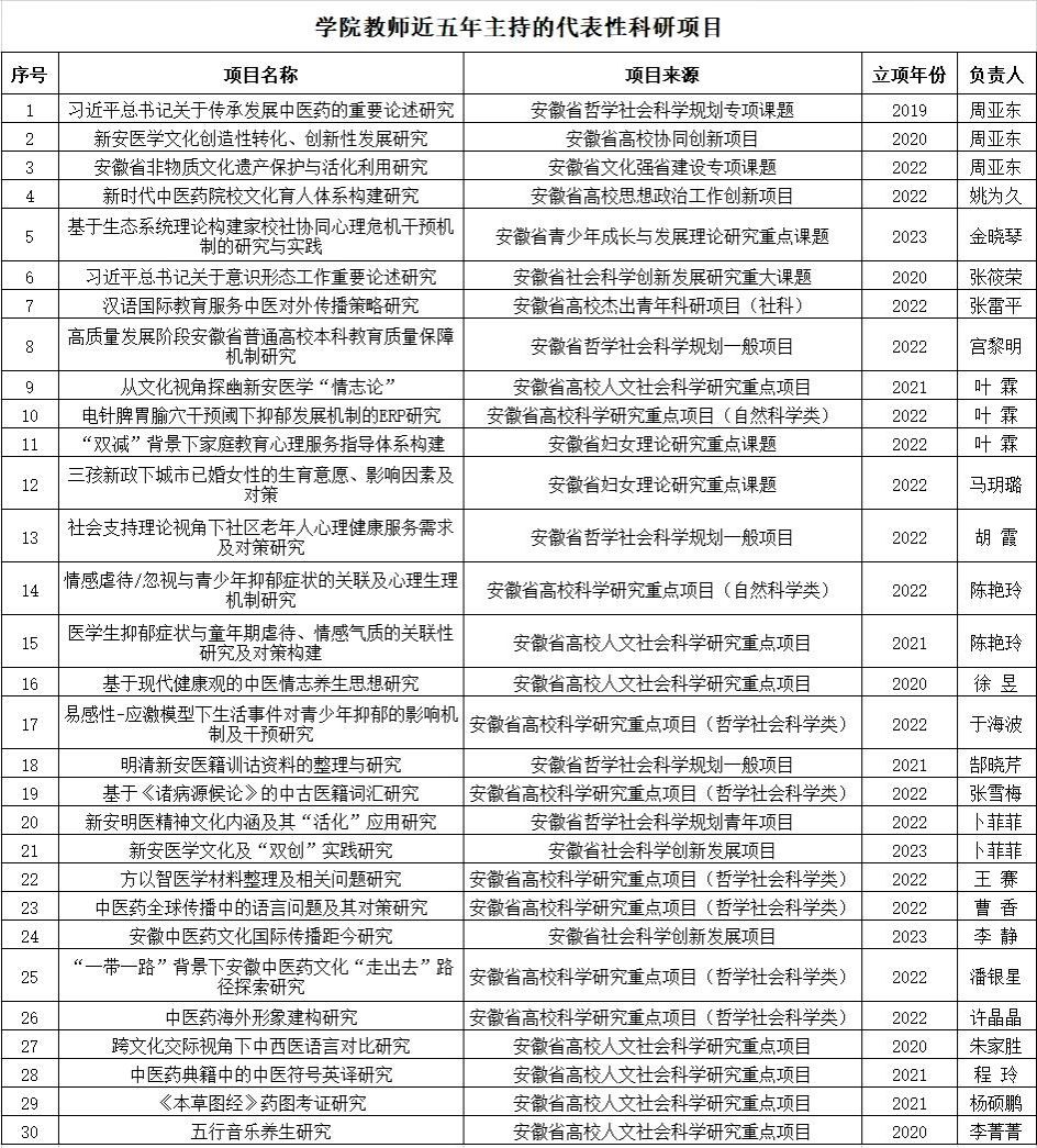 近年来,学院科研工作取得长足进步,在中医药文化研究、中医药翻译研究、语言文化研究(中国语言文学、外国语言文学)、心理健康与教育研究、艺术教育研究等方向,立项各级各类科研项目120余项,科研总经费近400万元,发表论文近300篇,出版教材及著作40余部,获得安徽省社会科学奖三等奖1项,其它各级各类科研奖项数十项。
