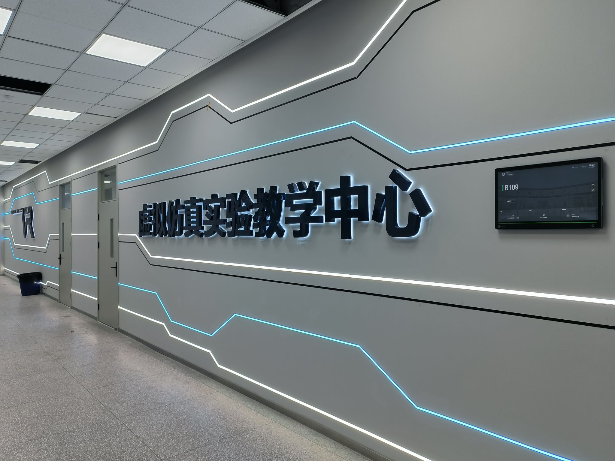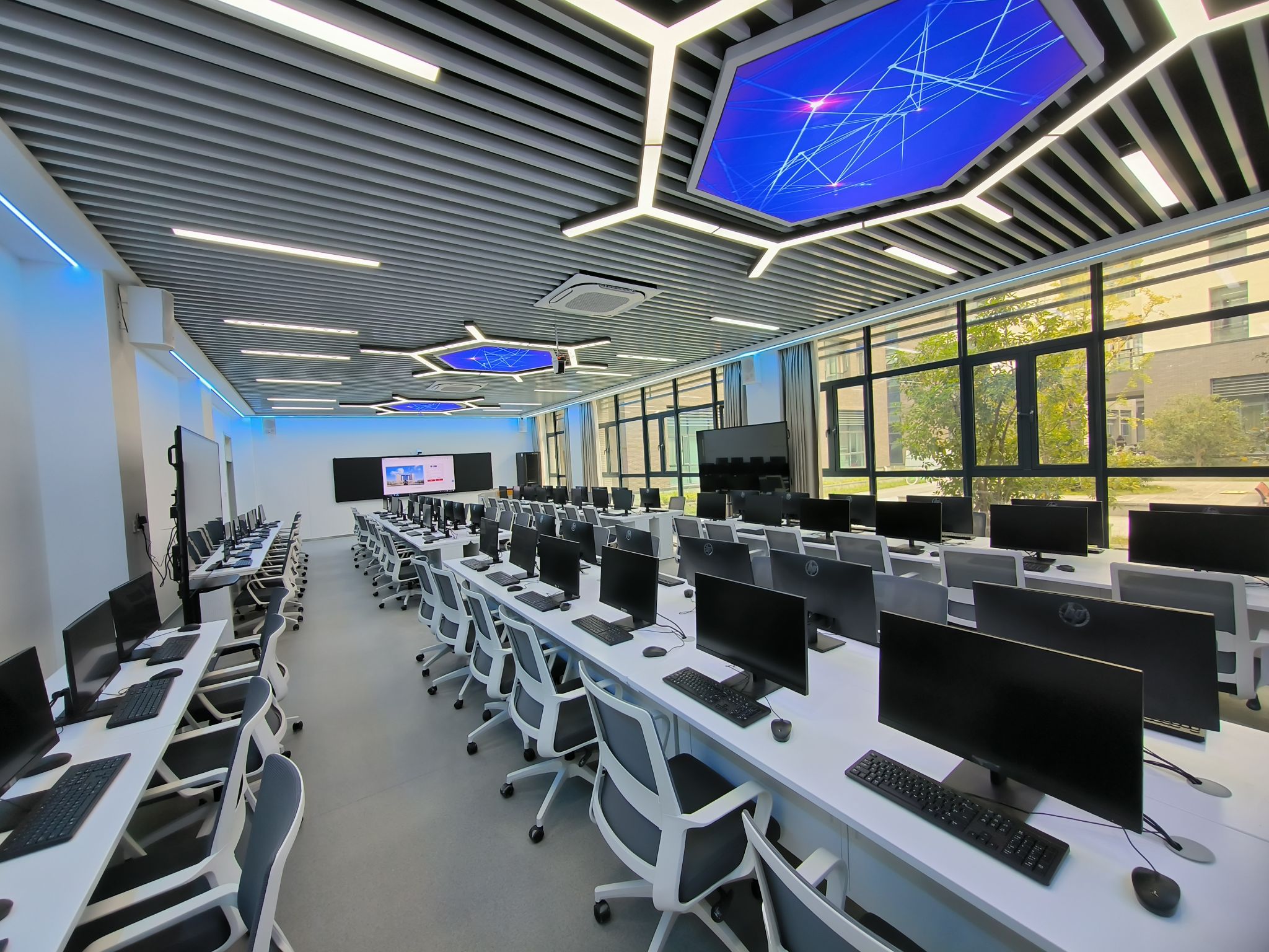 新建成的虚拟仿真实验室位于少荃湖校区至诚楼一楼,面积约为240㎡,是集VR、MR、计算机、多媒体、网络通信等信息技术、多学科、多领域融合的多功能虚拟仿真实验室,可同时容纳120人进行VR教学及实验实训教学,同步搭建虚拟仿真实验管理及共享平台,实现了虚拟仿真教学资源的统一管理与开放共享。