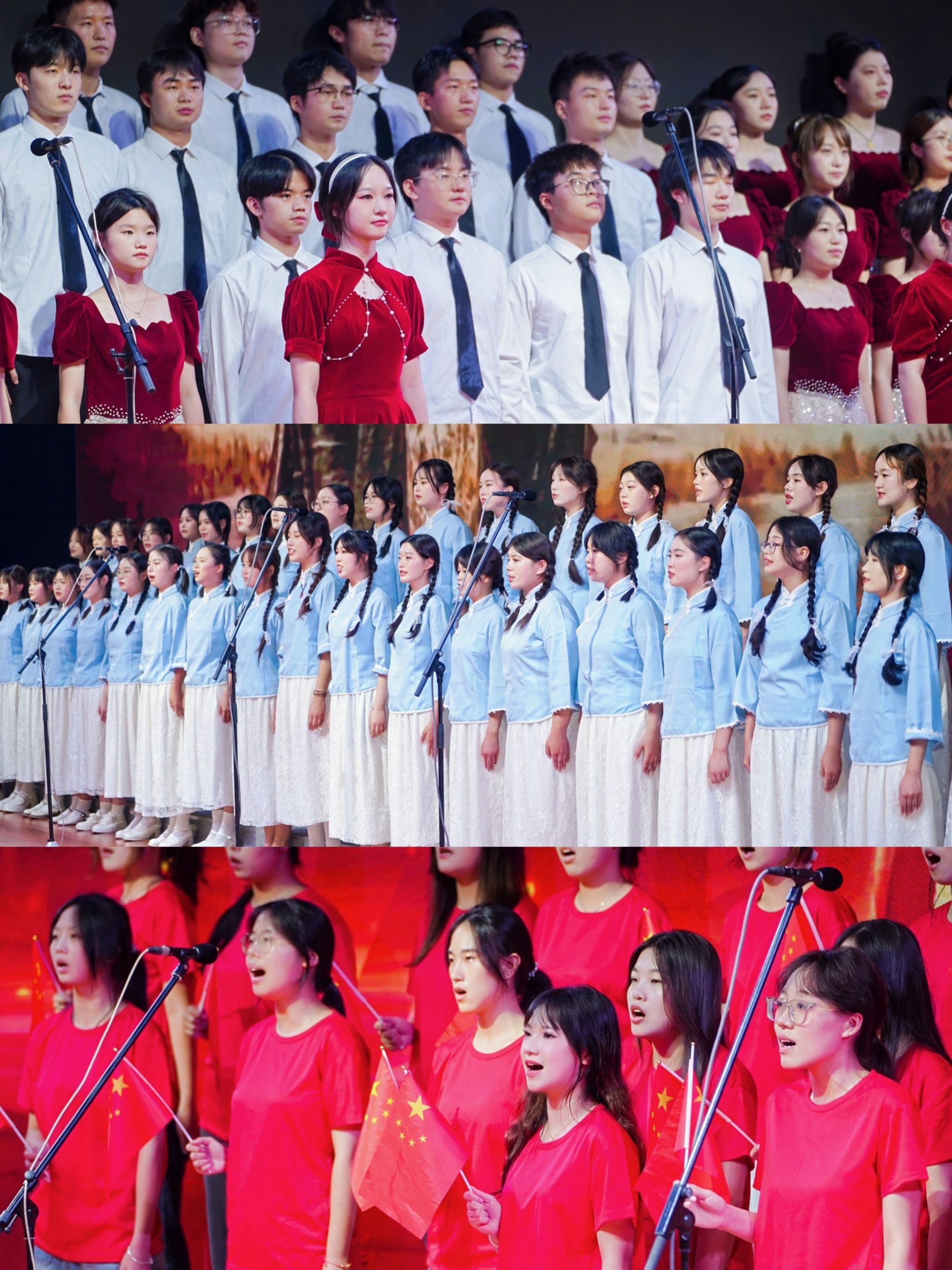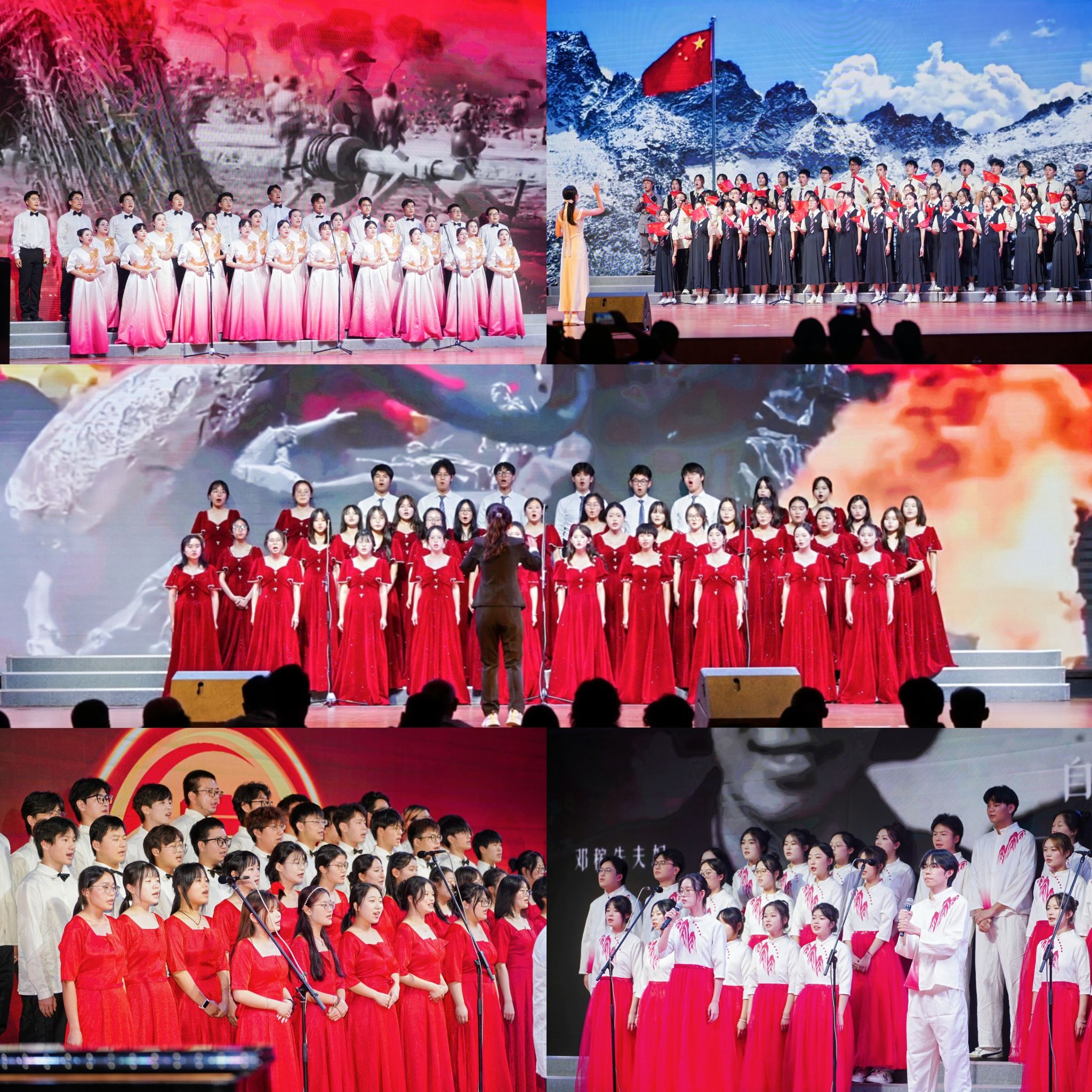 《团结就是力量》《保卫黄河》唱出了不屈的民族气节;《在太行山上》深情回顾烽火岁月,《如愿》则传递出新时代的美好愿景;当《我和我的祖国》旋律响起,全场师生情不自禁轻声跟唱;《没有共产党就没有新中国》奏响时,更将现场气氛推向高潮,激昂的歌声汇成一片红色的海洋;离退休工作处的老师们压轴献唱《在灿烂的阳光下》,用饱含岁月深情的歌声,唱出对祖国深沉的赞美与祝福,为整场演出画上圆满句号。