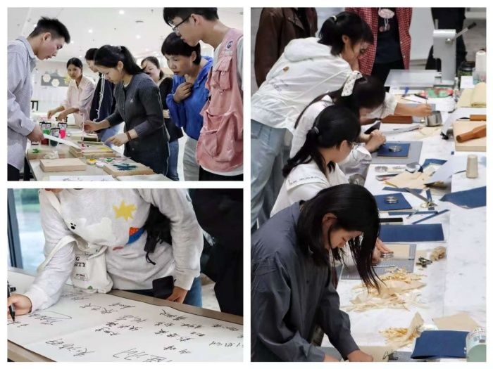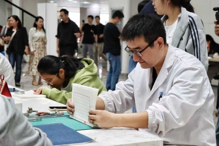 活动现场设置了多项体验环节,包括“守护中医瑰宝,青春义不容辞”签名活动、中医古籍修复技艺体验、“大医精诚”及“十大皖药”拓印体验、非遗漆扇制作体验、线装书装订体验以及中医药文创展示等。古籍修复师围绕“古籍装帧形式”与“雕版印刷技艺”进行专业讲解,向师生们介绍了雕版印刷技艺的历史流变以及古籍装帧形式的演变历程。在指导老师的带领下,师生们亲手参与漆扇制作,并深入了解图书馆自主开发的系列文创产品。