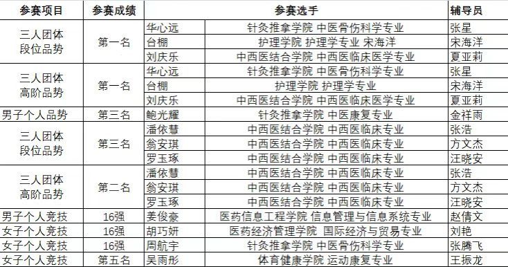 本届赛事由中国学生体育联合会主办,汇聚了全国高校品势、竞技的高水平选手。安徽中医药大学跆拳道队此次表现亮点十足:刘庆乐、台棚、华心远组成的三人团队,在甲组男子三人团体段位品势项目中摘得金牌,实现学校该项目金牌“零的突破”,另在男子甲组三人团体高阶品势中技压群芳,再夺一枚金牌!由潘依慧、翁安琪、罗玉琢组成的三人团队,在甲组女子三人团体高阶品势中收获银牌,又在女子三人团体段位赛中获得团体铜牌。