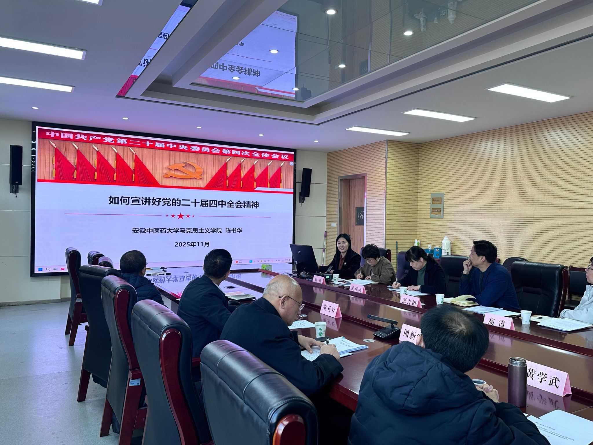 会上,宣讲团团长董玉节宣读了关于调整安徽中医药大学理论宣讲团成员的通知文件并部署校内宣讲安排。宣讲团副团长、马克思主义学院党总支书记黄学武交流宣讲体悟,宣讲团副团长、宣传部副部长张磊传达省委教育工委有关文件精神。