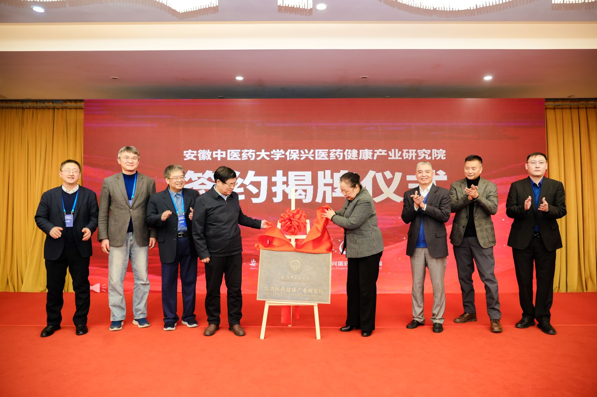 12月18日,安徽中医药大学与保兴产业园共建保兴医药健康产业研究院签约揭牌仪式暨“创新引领医药产业新质生产力发展”研讨会在合肥成功举办。国家药监局原副局长惠鲁生,省人大常委会原副主任、省总工会原主席宋国权,安徽省卫生健康委党组书记刘同柱,安徽省生命健康产业推进组办公室主任徐雪晖,安徽省药品监督管理局副局长张磊,阜阳市太和县委副书记、县长陈建华,安徽省社科联原党组书记、研究员程必定,北京大学政府管理学院企业与政府研究所所长宋磊,保兴医药健康产业园董事长张建强,学校党委书记谢瑞瑾等出席签约揭牌仪式。仪式由校党委常委、副校长魏骅主持。