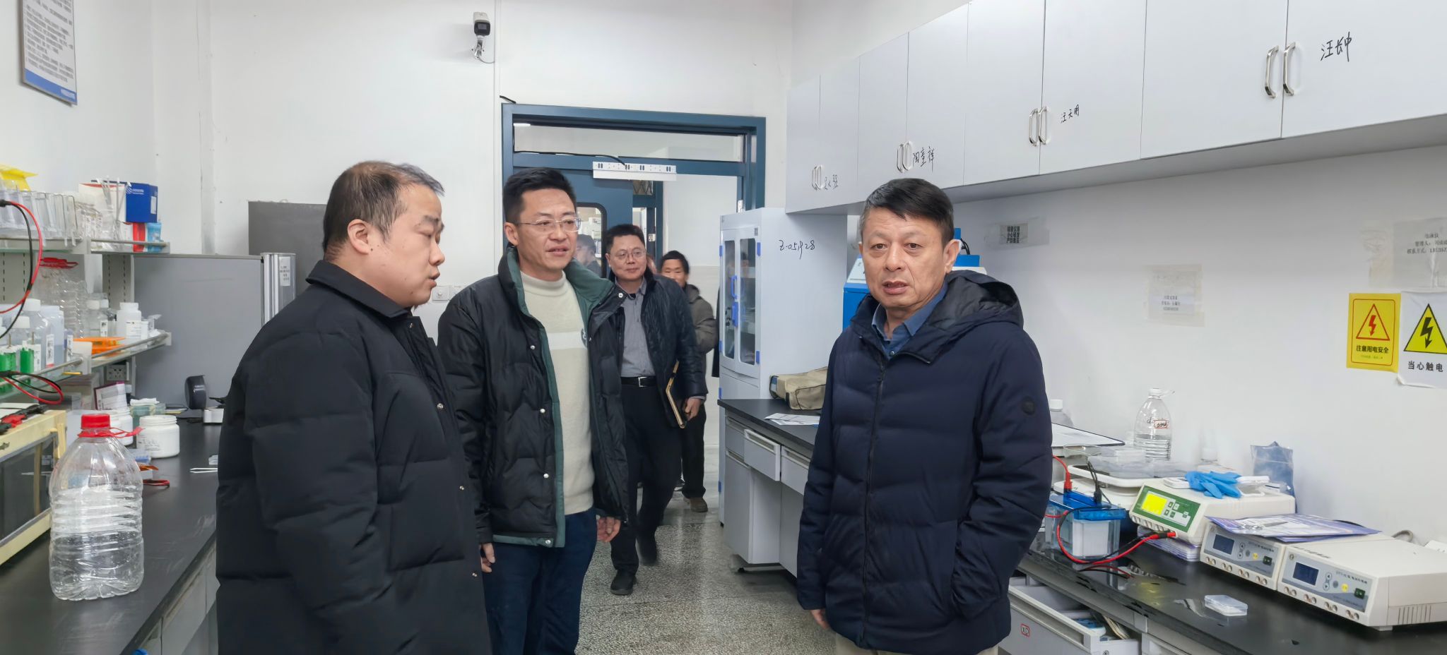 许钒一行重点查看实验室管理制度健全落实、大型仪器设备及实验试剂规范存储、实验人员操作规范及实验室安全用电等情况,同时对消防安全设施配备、疏散通道畅通等关键环节进行细致排查。许钒边检查边详细询问各实验室日常管理、安全巡查、应急处置等工作开展情况,深入了解教学科研过程中存在的安全风险点。