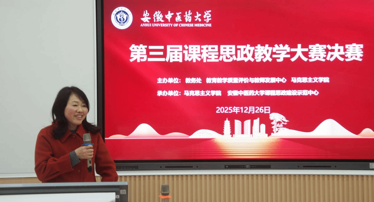桂双英在致辞中强调,立德树人成效是检验学校一切工作的根本标准,全面推进课程思政建设是落实立德树人根本任务的战略举措。桂双英指出,学校课程思政建设必须牢牢把握教师队伍“主力军”、课程建设“主战场”,系统构建协同育人格局。近年来,学校依托课程思政建设示范中心,建立了“红色杏林”大思政课专题网站,出版了《安徽中医药大学课程思政教学案例选编》,引导专业课教师充分挖掘专业课程蕴含的思政元素,让思政教育如春风化雨般融入课堂教学,浸润学生心灵。桂双英指出,本次课程思政教学大赛既是我校课程思政建设成果的一次集中展示,也是老师们教学水平与育人能力的一场同台竞技。希望各位参赛教师赛出水平、赛出风采,充分展现我校专业教师课程思政教育教学能力,为全校教师提供示范。