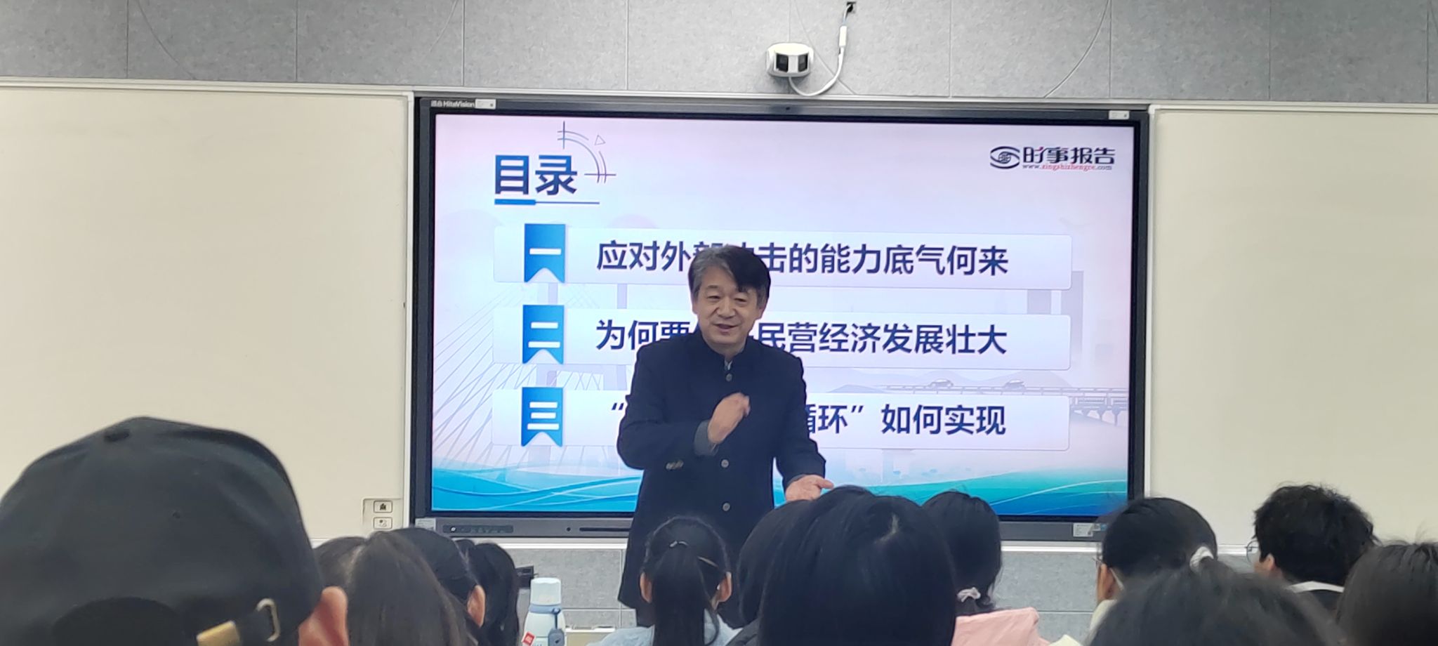 学校党委常委、副校长聂久胜为第一临床医学院2025级中医学专业学生讲授《正确认识中国经济热点问题》专题。他从应对外部冲击的能力底气何来、为何要促进民营经济发展壮大、如何实现“做强国内大循环”三个方面进行讲解,围绕当下热点民生问题,以鲜活的案例不断启发学生思考。聂久胜指出,困难挑战年年有,但我们从来都是在风雨洗礼中发展、在历经考验中壮大的。只要一以贯之谋发展、一茬接着一茬干,必将推动我国经济社会发展不断取得新的更大成就。