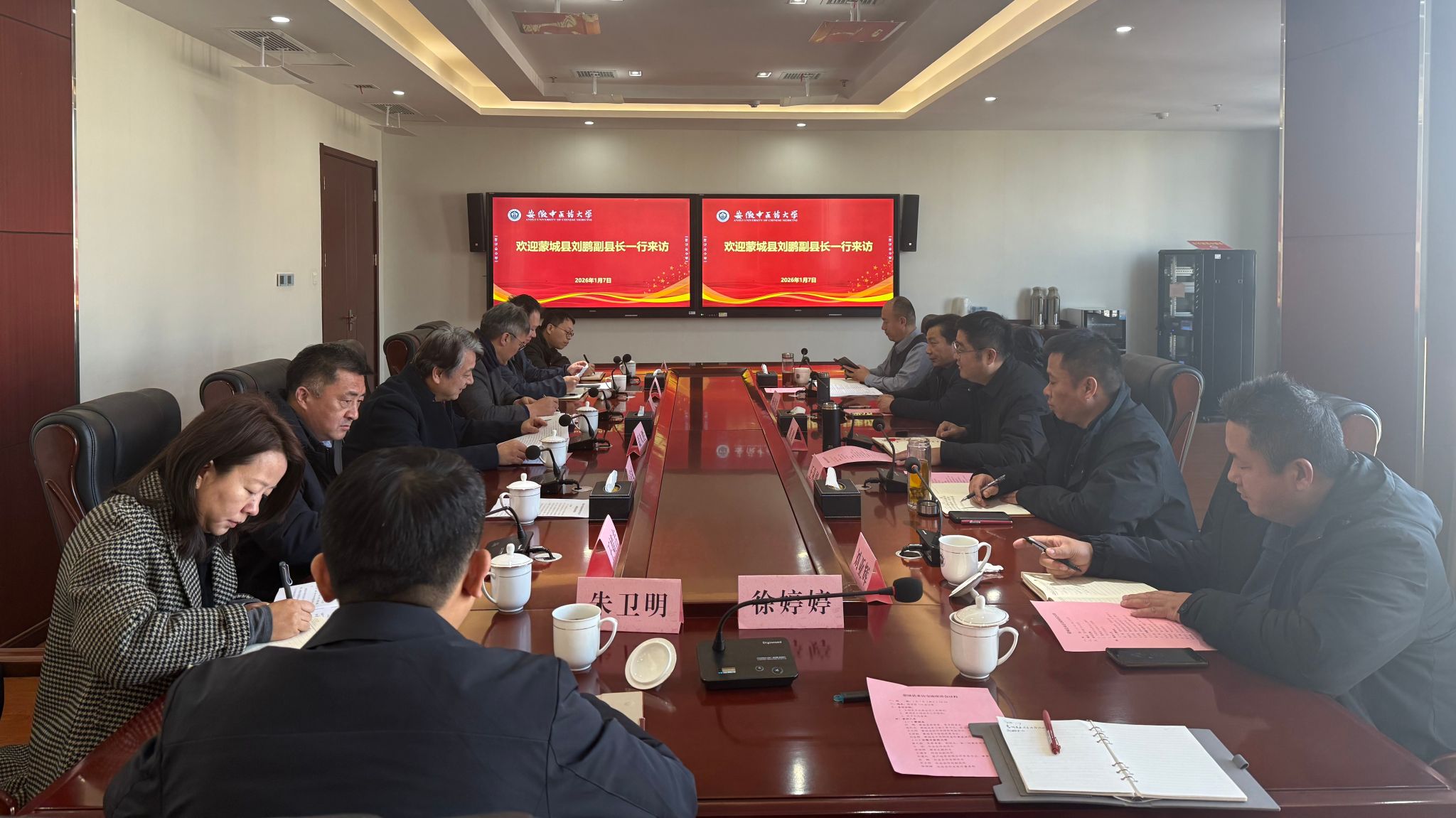 1月7日上午,蒙城县委常委、常务副县长刘鹏率队来访我校,就深化校地合作、助力县域医疗高质量发展开展交流座谈。学校党委常委、副校长聂久胜出席会议并讲话。教务处、科技处、社会合作处、资产经营有限公司相关负责同志参加座谈。