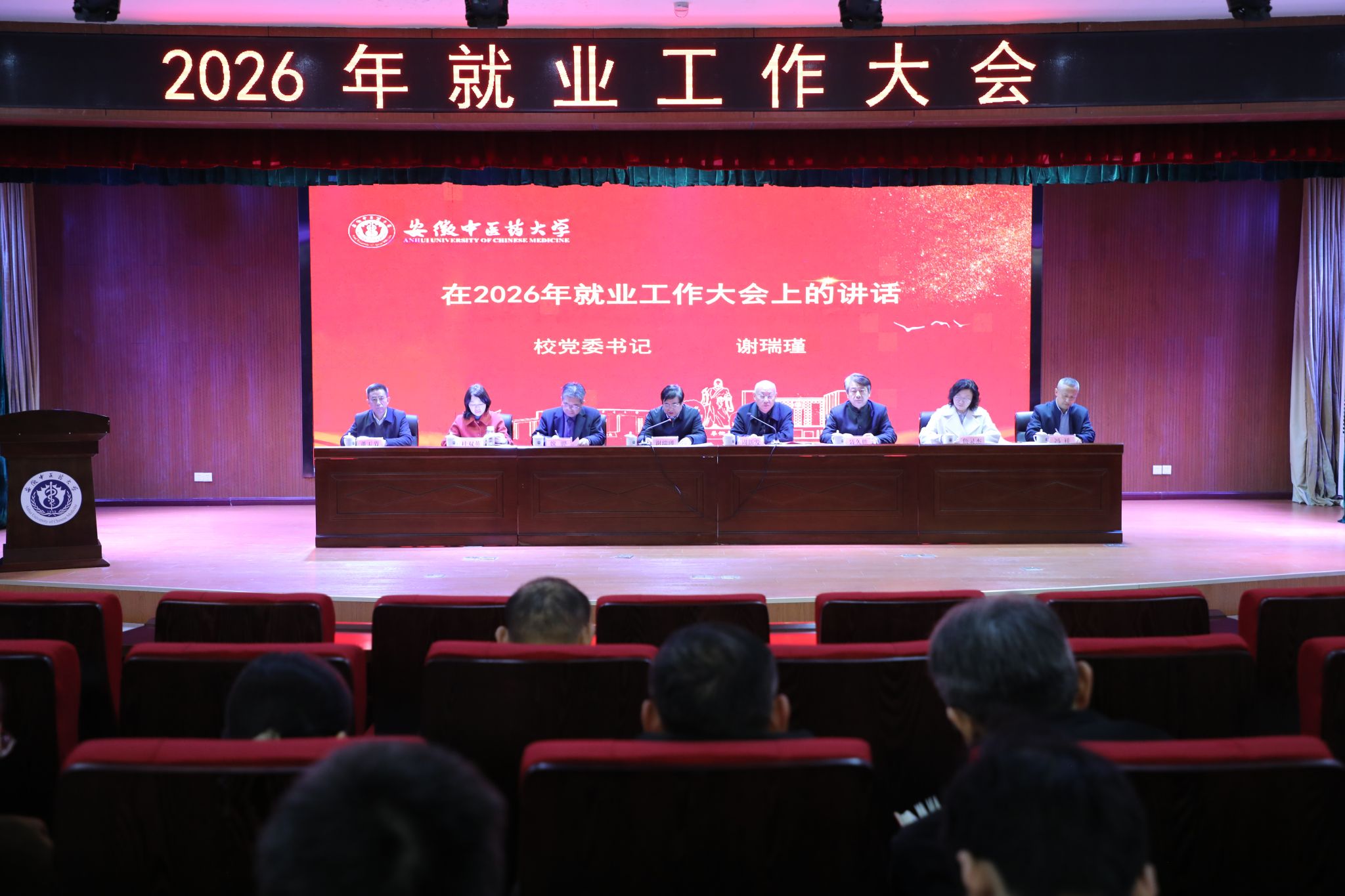 1月16日上午,学校在少荃湖校区图书馆G层报告厅召开2026年毕业生就业工作大会。校党委书记谢瑞瑾出席会议并作工作部署。会议由校党委副书记周新发主持。校党委常委、副校长魏骅、聂久胜、桂双英,党委常委、纪委书记、监察专员詹灵杰,党委常委董玉节、冯祥出席会议。学校相关职能部门主要负责同志,各学院党政班子成员,附属单位负责同志,研究生导师代表,就业工作秘书及全体专兼职辅导员参加会议。
