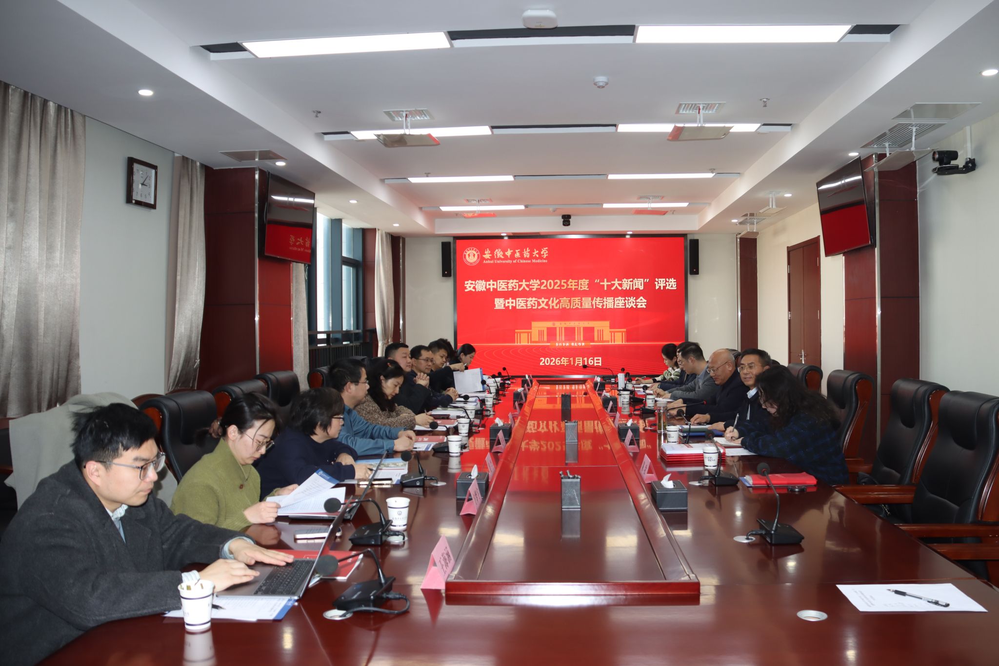 1月16日下午,学校召开2025年度“十大新闻”评选暨中医药文化高质量传播座谈会。校党委副书记周新发出席并致辞,校党委常委、宣传部部长董玉节主持会议。中央及省级主流媒体代表、在肥三所直属附属医院宣传负责人等参会。