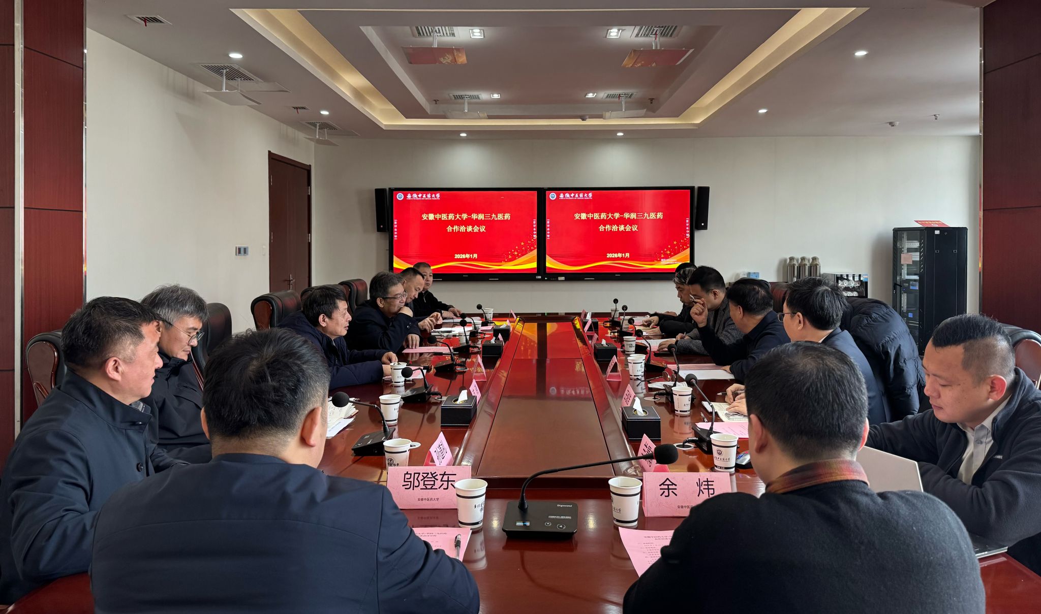 1月22日上午,华润三九医药原副总裁、中药创新研究院顾问王进元,国药事业部总经理钱伟率队来校洽谈合作。校党委副书记、校长许钒,校党委常委、副校长魏骅,科技处、社会合作处、资产经营有限公司、科技产业园公司相关负责人参会。魏骅主持会议。