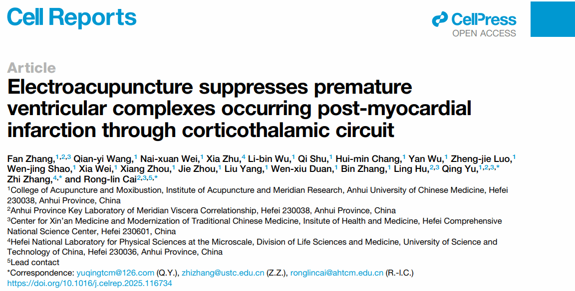 1月27日,我校针灸推拿学院蔡荣林教授团队,联合中国科学技术大学生命科学院张智教授团队,在国际权威杂志Cell子刊《Cell Reports》(中科院一区Top期刊)发表题为“Electroacupuncture Suppresses Premature Ventricular Complexes Occurring Post-myocardial Infarction through corticothalamic circuit”的高水平原创性研究论文。安徽中医药大学为第一通讯单位,中西医结合学院张帆博士后为论文第一作者,针灸推拿学院蔡荣林教授、余情副教授及中国科学技术大学生命科学院张智教授为论文共通讯作者。这一成果是我校针灸团队在经脉脏腑相关研究领域长期积累的突出标志性成果。