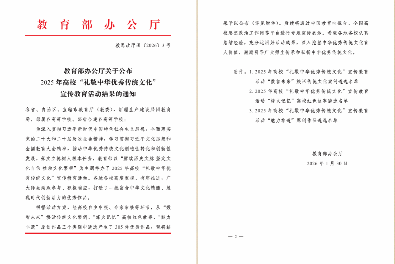 近日,教育部办公厅公布了2025年高校“礼敬中华优秀传统文化”宣传教育活动结果。我校申报的《从“望闻问切”到数智交互——中医药文化传承的AI破壁实验》成功入选“数智未来”焕活传统文化案例遴选名单。