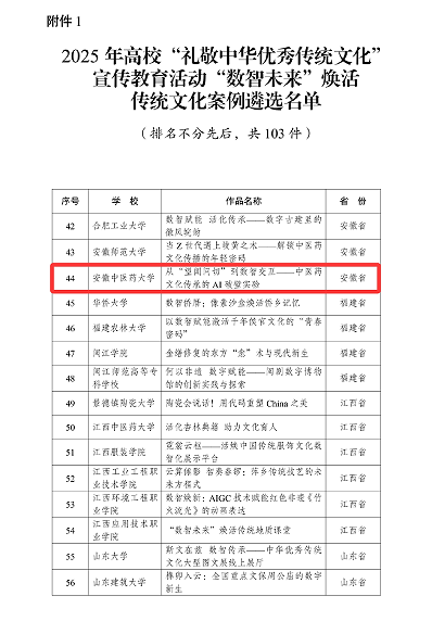 下一步,学校将以此次入选为契机,深入挖掘中华优秀传统文化育人价值,搭建具有“中医药味”的文化传承实践平台,激励引导广大师生在传统文化数字化等领域持续探索,坚定文化自信,为赓续中华文脉、培育时代新人贡献安中大力量。