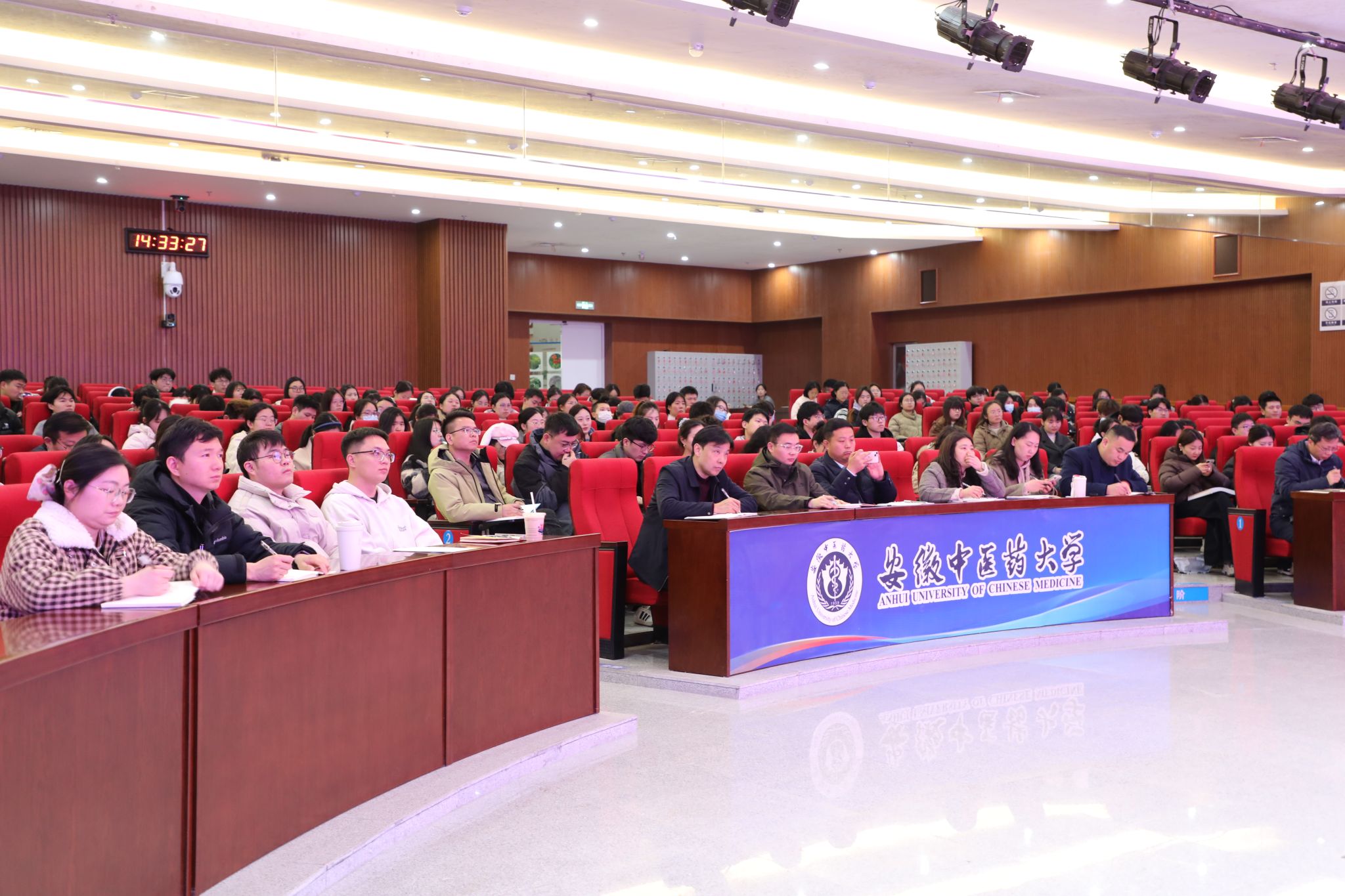 谢瑞瑾立足当前形势,从就业的重要意义、就业形势分析、安中大学子的就业优势以及科学规划职业发展等四个维度,为毕业生带来一堂内容详实、思想深刻的就业指导课。他深入剖析了当前就业市场中存在的结构性矛盾,并结合优秀校友的成长经历与奋斗故事,引导毕业生准确把握国家战略强力牵引、大健康产业蓬勃兴起、基层医疗人才需求巨大以及中医药国际化拓展的新空间所带来的宝贵机遇,鼓励大家主动调整心态、持续提升能力、顺应时代趋势、积极担当作为。谢瑞瑾希望2026届毕业生要调整心态,勇于打破“四种思维定式”;要抓住校招契机,用足用好“家门口的主场优势”;要提升专业技能,练就“不可替代的专业本领”;要坚守底线,做到“诚信就业、平安就业”。他勉励全体毕业生要将个人理想融入国家发展大局,以青春奋斗服务“健康中国”建设,在新的人生征途中踔厉奋发、勇毅前行。