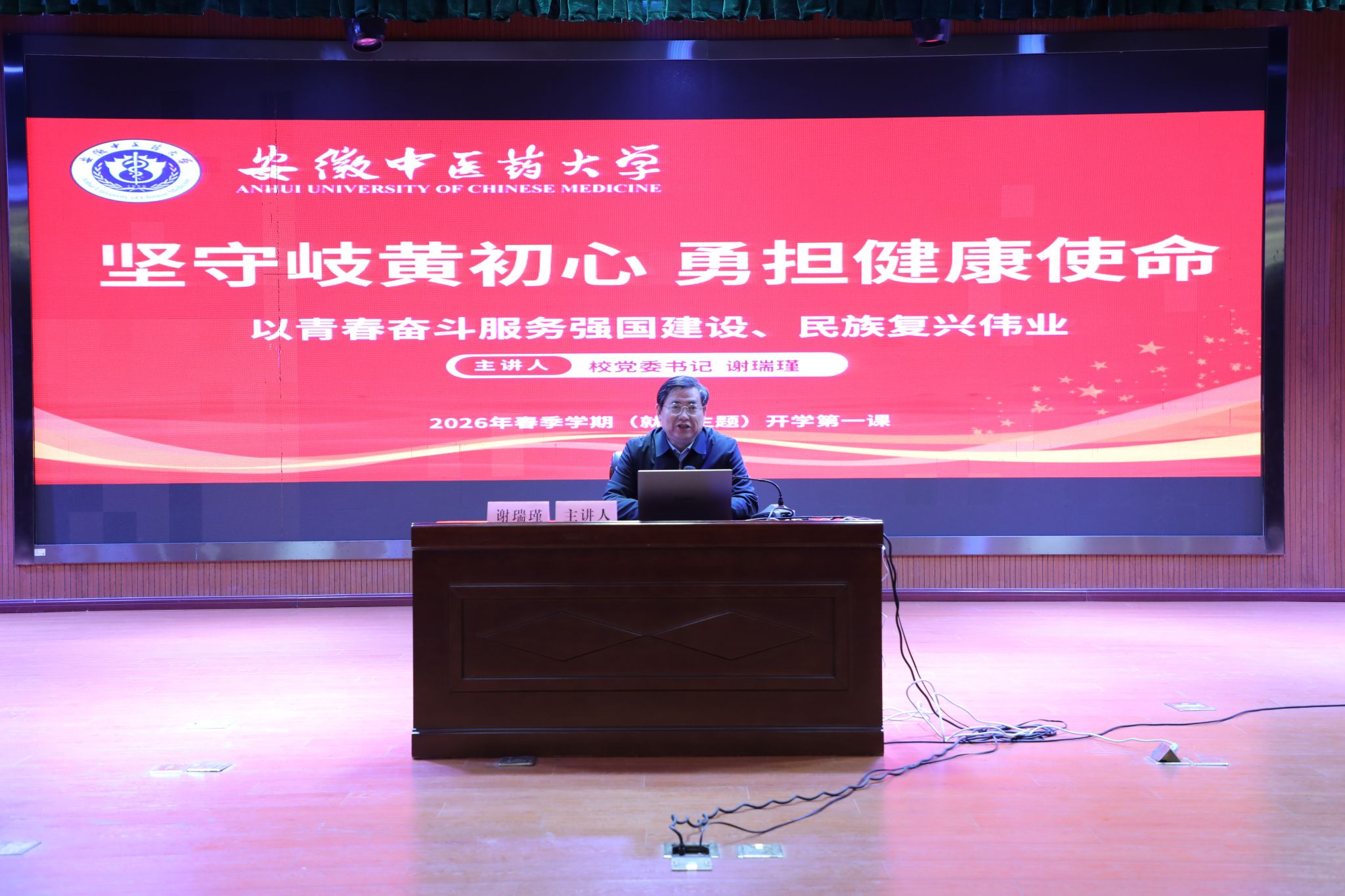 为全面落实立德树人根本任务,全力促进毕业生高质量充分就业,3月16日下午,校党委书记谢瑞瑾以《坚守岐黄初心 勇担健康使命 以奋斗青春服务强国建设、民族复兴伟业》为题,为2026届毕业生讲授春季学期就业主题“开学第一课”。会议由学生处主要负责人主持,各学院分管学生工作负责人、2026届毕业班辅导员及毕业生代表共240余人现场聆听。