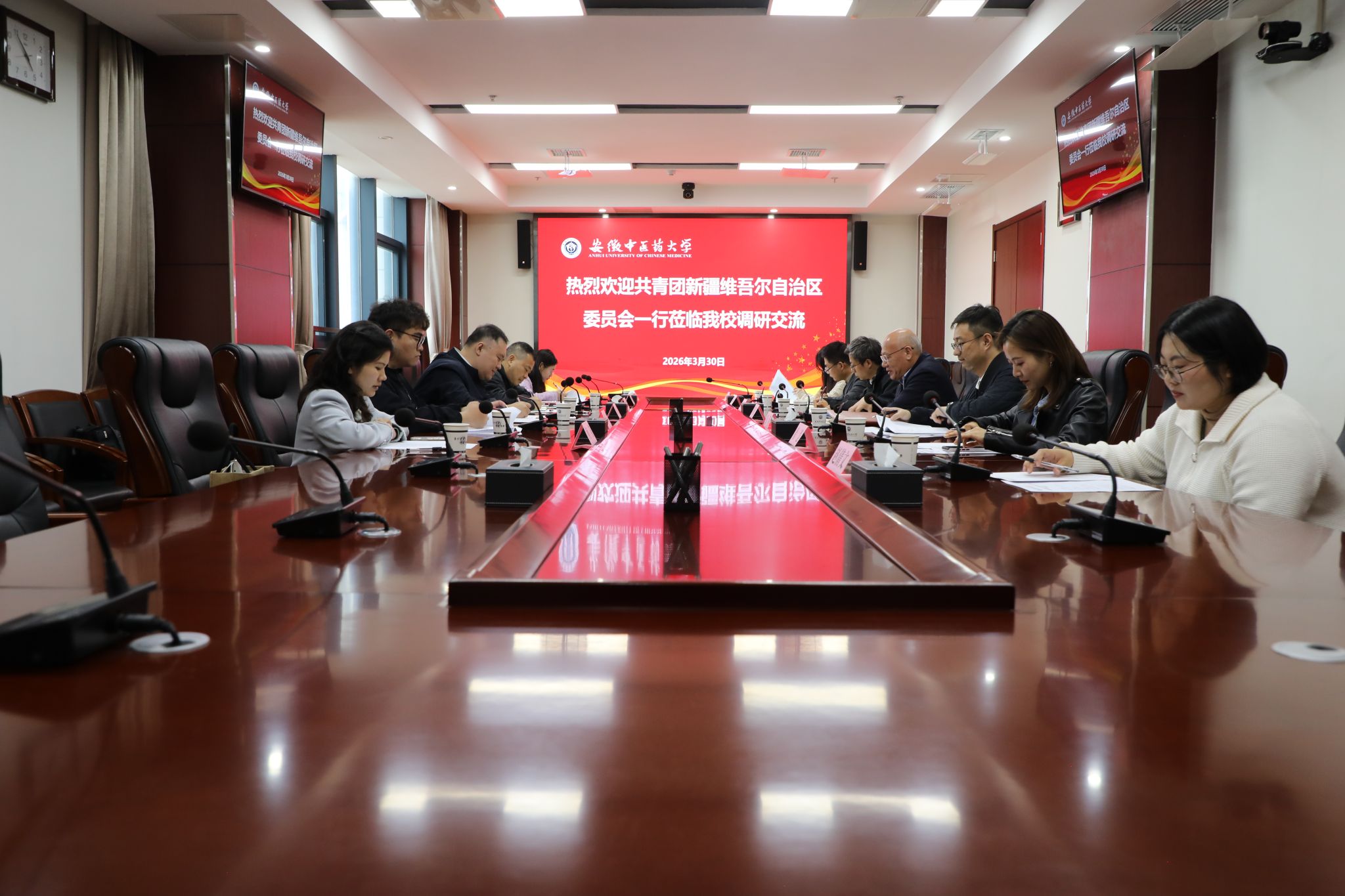 周新发代表学校对刘恺书记一行来访表示热烈欢迎,并全面介绍学校基本情况,以及我校与新疆地区在药材种植、师资共建、青年交流等方面的合作进展。他指出,中医药是中华文明的瑰宝,民族医药是中华文化的重要组成部分,深化皖疆两地青年人才培养、中医药文化传播、就业创业协作等方面的合作意义重大、前景广阔。希望以此次交流为新起点,进一步加强与新疆共青团组织的对接协作,携手搭建更多务实合作平台,推动两地青年互动往来、人才共育、资源共享,共同谱写皖疆中医药事业与青年工作协同发展的新篇章。